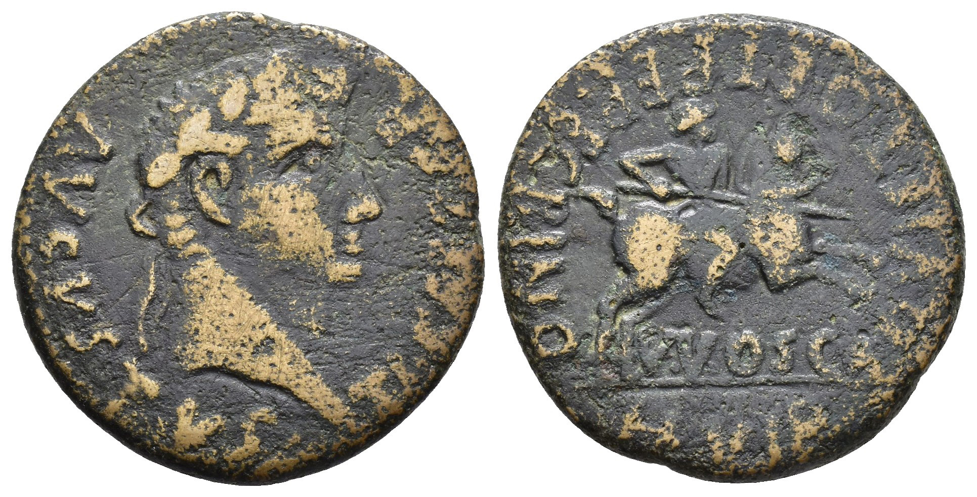 HISPANIA ANTIGUA. BOLSKAN-OSCA. Tiberio. As. A/ Cabeza laureada a der.; TI CAESAR AVGVSTVS. R/ Jinete lancero a der.; QVIETO ET PEREGRINO/ V V OSCA/ II VIR. AE 8,21 g. 26 mm. I-1937; APRH-295; ACIP-3225; CC-4678, mismo ejemplar. Porosidades. MBC-.