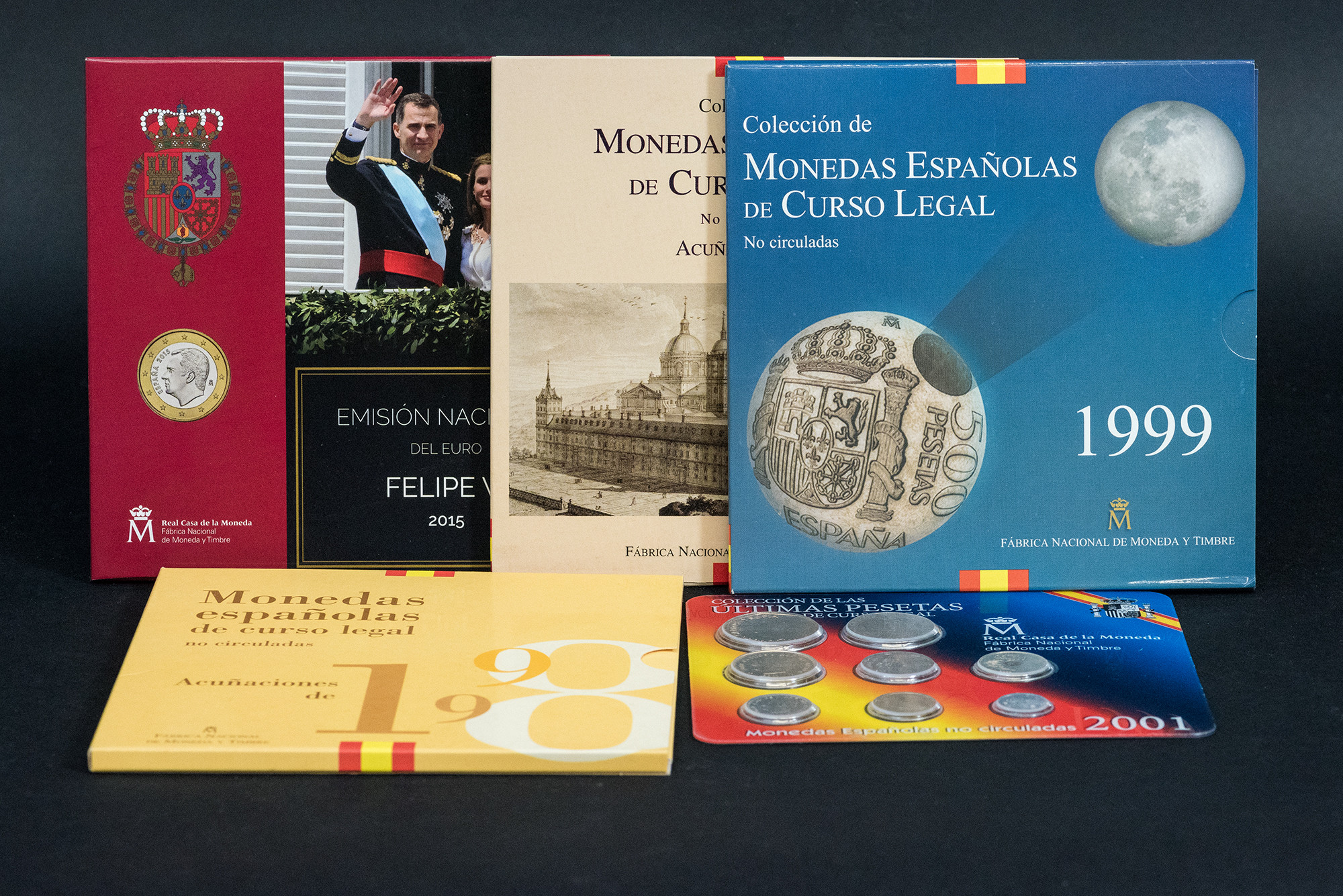 JUAN CARLOS I. Lote de 5 blísters FNMT: Monedas españolas de Curso legal 1997 a 1999; Últimas pesetas 2001 y Felipe VI 2015. SC.