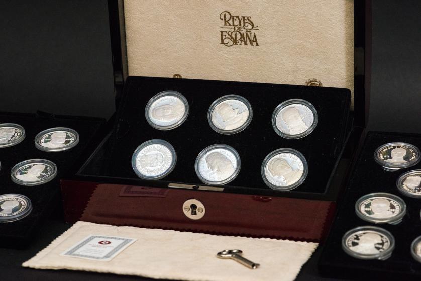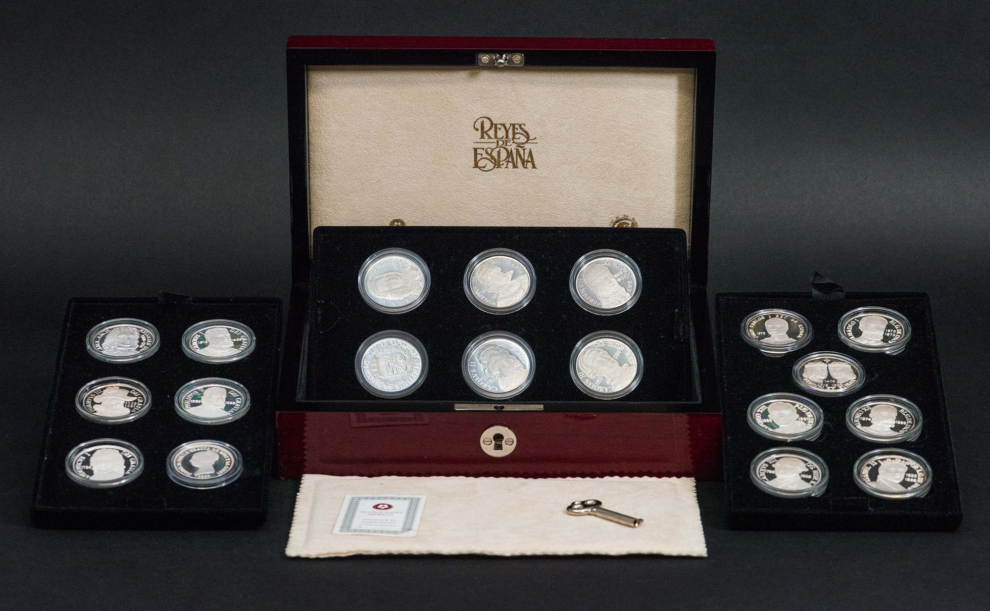 JUAN CARLOS I. Lote de 18 medalla de plata de los reyes de España. Acuñación Ibérica. En su caja de madera. Prueba.