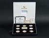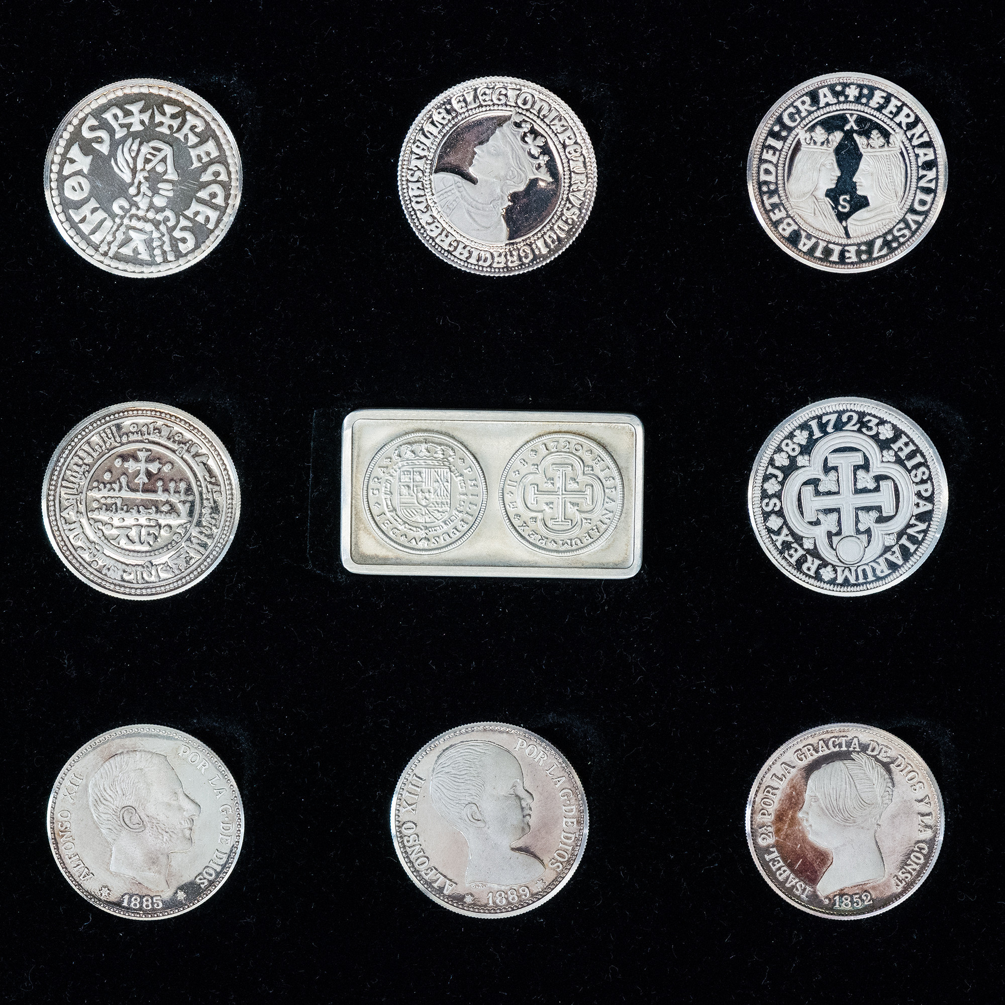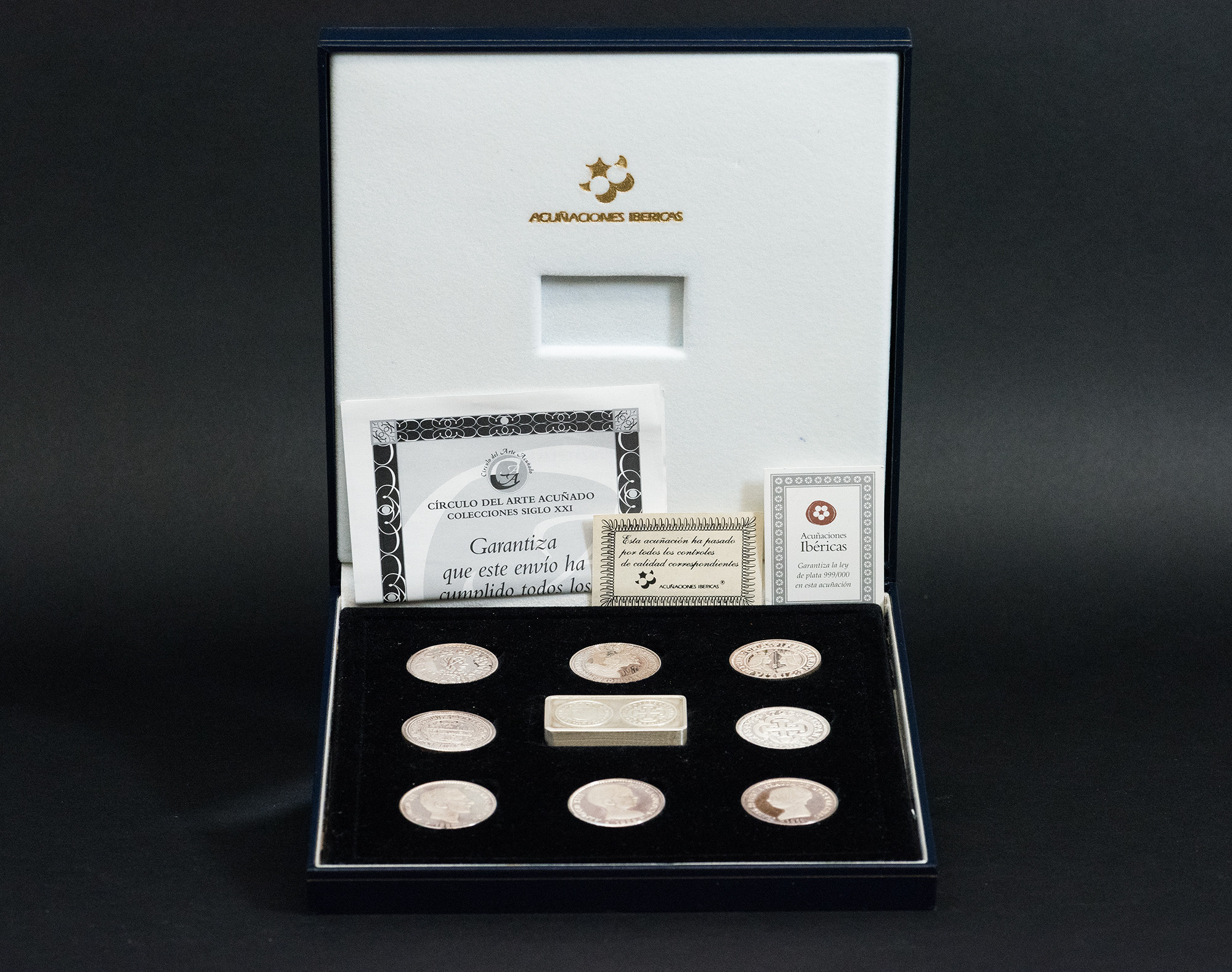 JUAN CARLOS I. Estuche con 8 medallas y un lingote de plata. Acuñación Ibérica. En estuche y con certificado. Prueba.