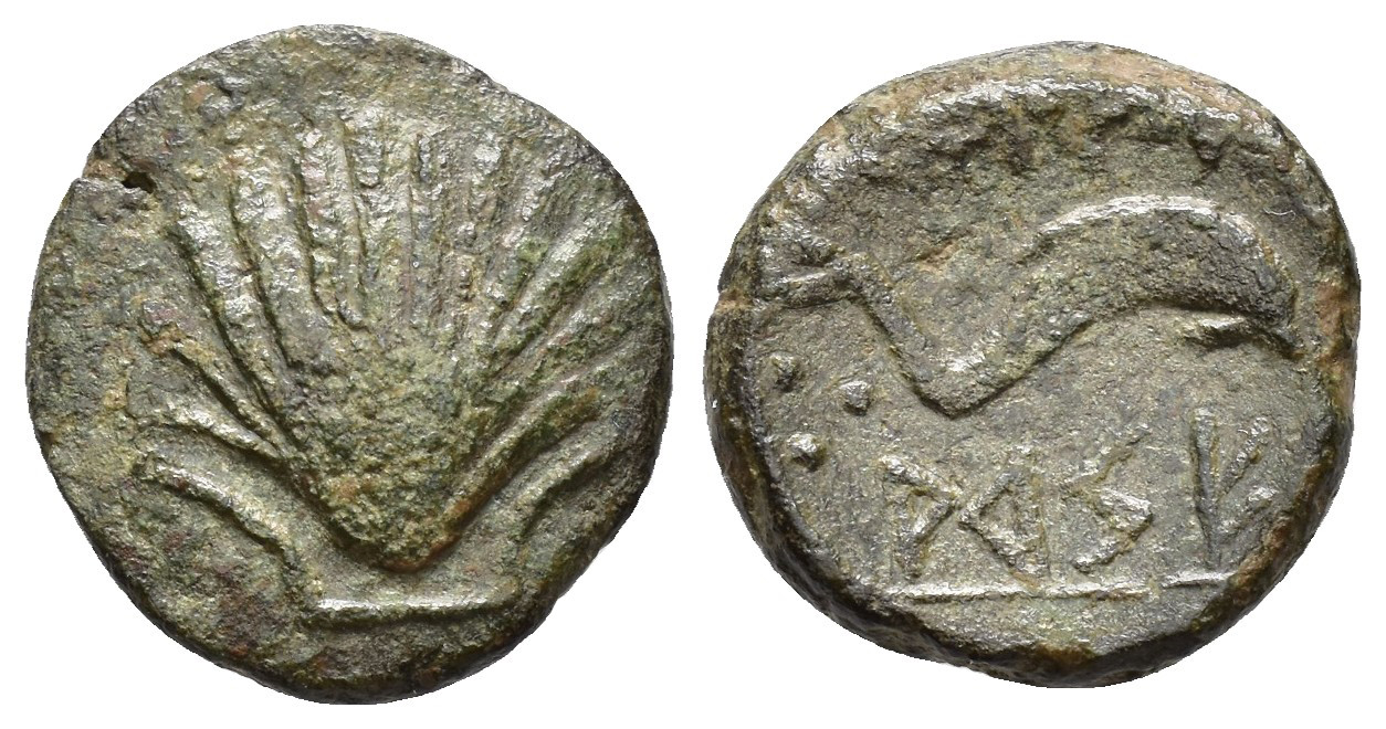 HISPANIA ANTIGUA. ARSE-SAGVNTVM. A/ Venera. R/ Delfín a der., encima C.A.P.V., debajo, sobre línea, inscripción ibérica ARSE y tres puntos bajo la cola del delfín. AE 3,88 g. I-no: ACIP-no; CC-1125, mismo ejemplar. Pátina verde oscuro. MBC. Rara.