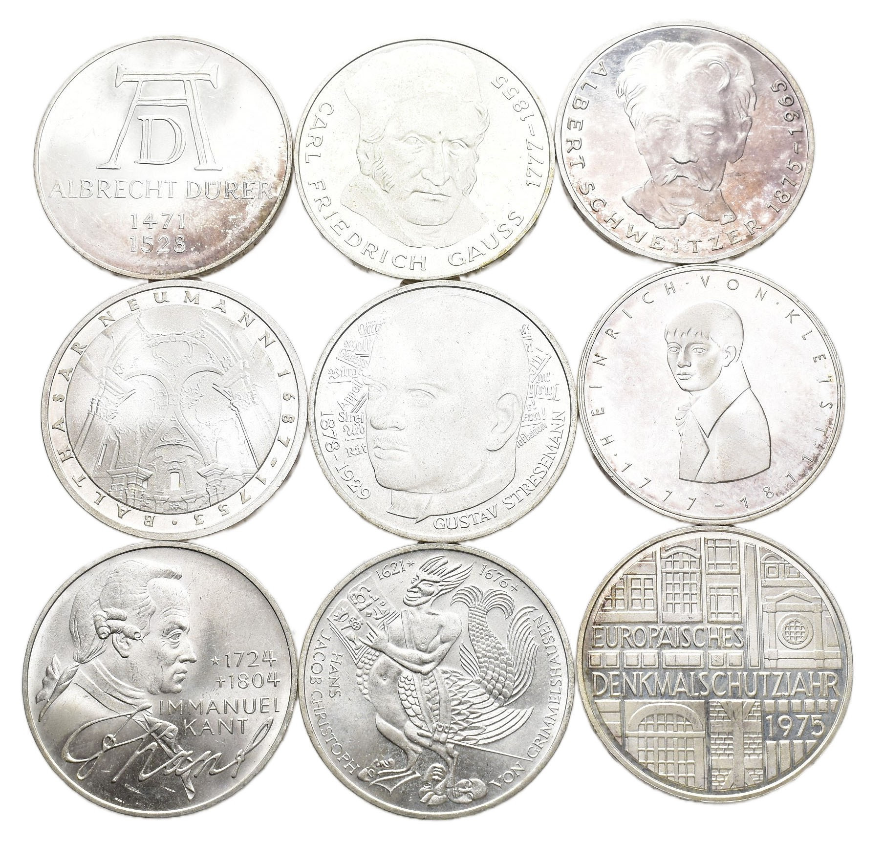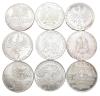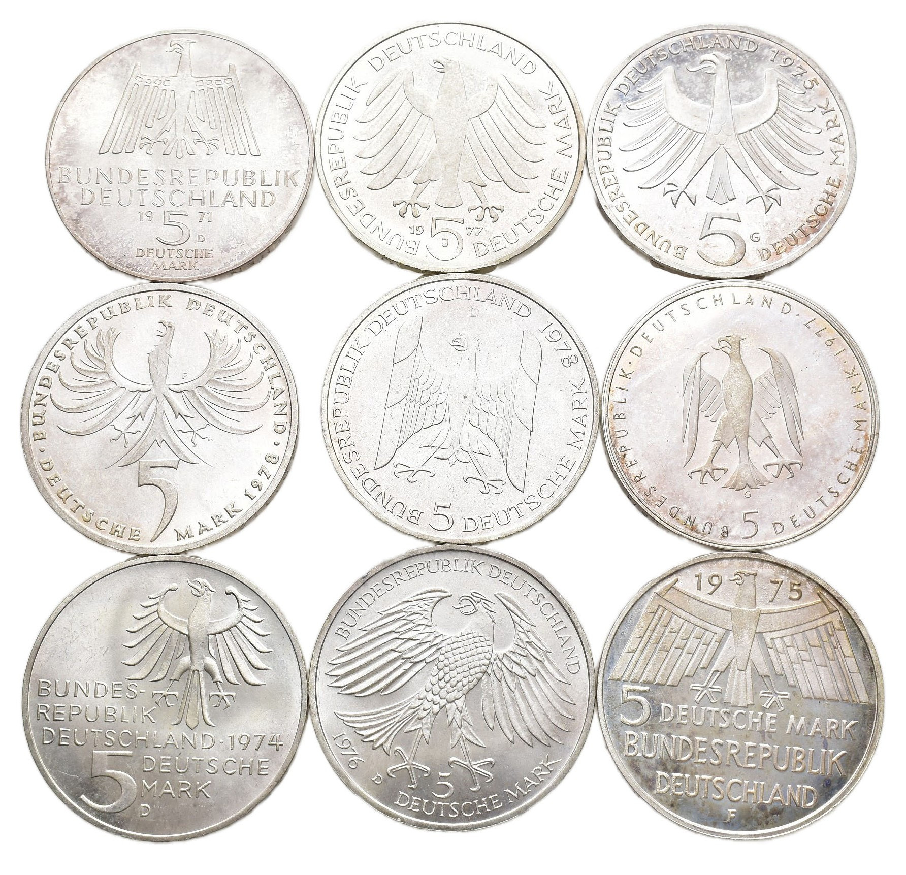MONEDA EXTRANJERA. ALEMANIA. Lote de 9 piezas de 5 marcos: 1971 D, 1974 D, 1975 F y G, 1976 D, 1977 G y J, 1978 D y F. SC.