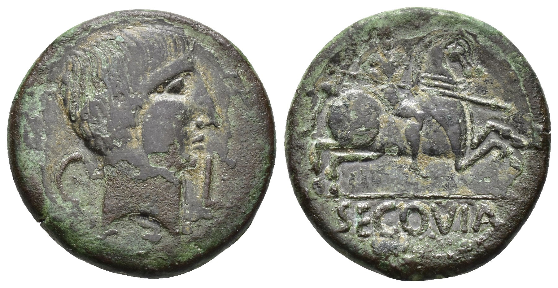HISPANIA ANTIGUA. SEGOVIA. As. A/ Cabeza masculina a der. (¿Augusto?), C-L. R/ Jinete lancero a der., exergo SEGOVIA. AE 8,57 g. 24,4 mm.  I-2193; APRH-478; ACIP-1867.  Pátina verde con erosiones. MBC.