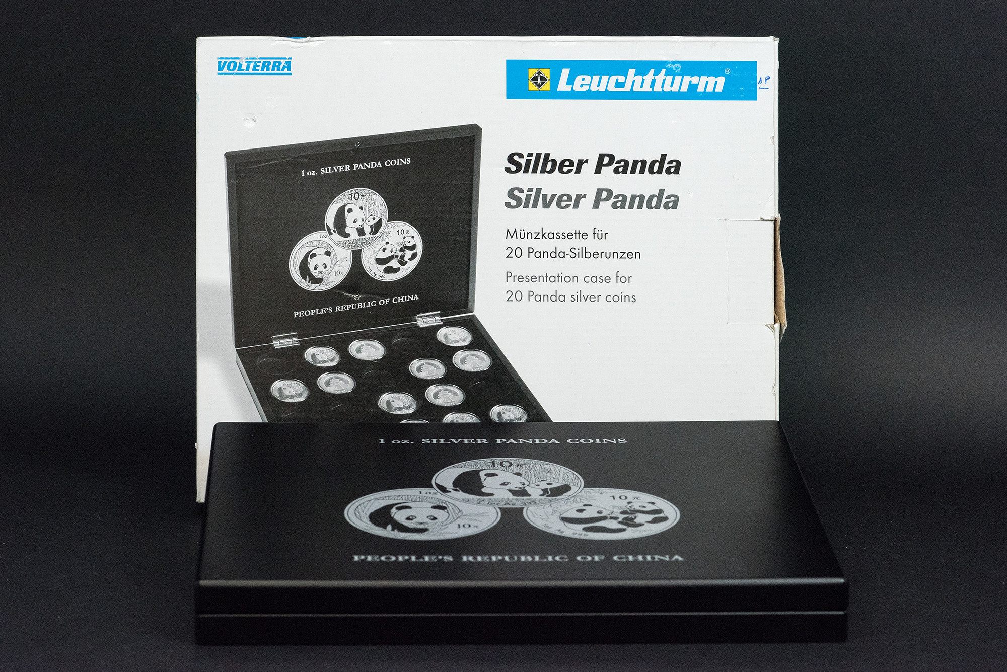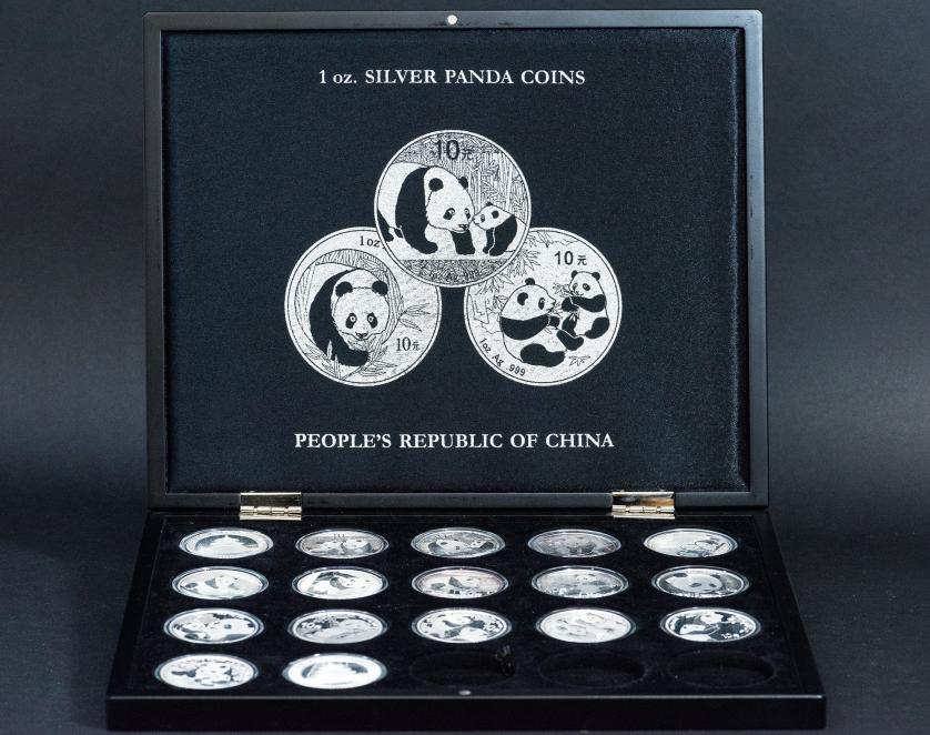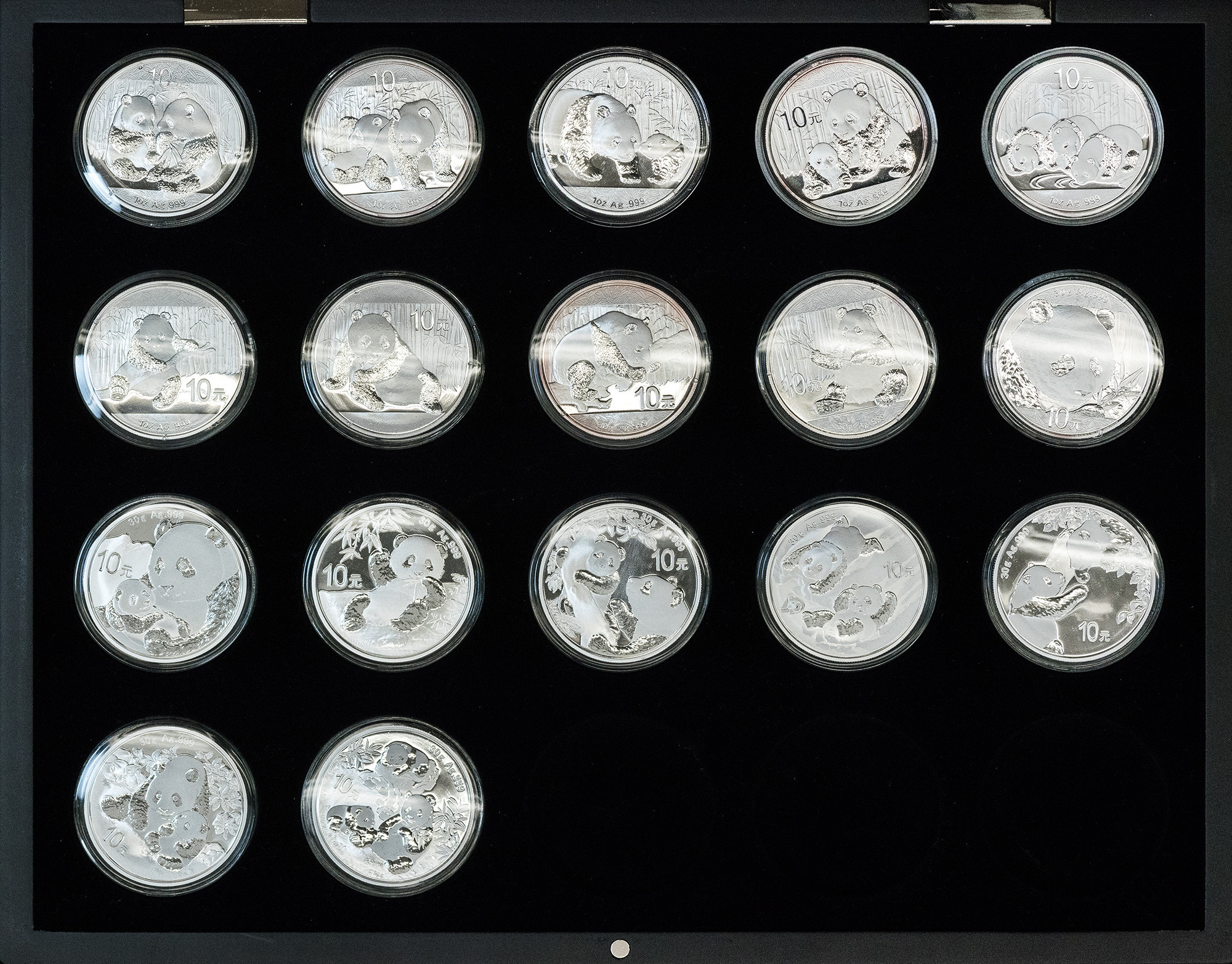 MONEDA EXTRANJERA. Lote de 17 piezas de 10 yuan, Panda, 2009 a 2025, en estuche especial de Leuchturm. Prueba.