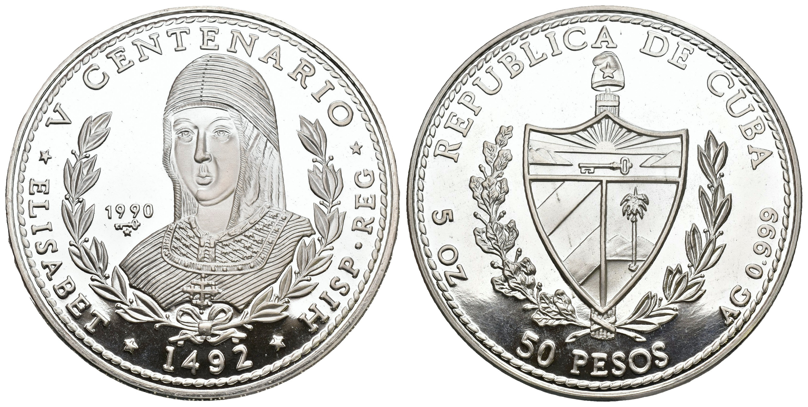 MONEDA EXTRANJERA. CUBA. 50 pesos. 1990. V Centenario. Isabel la Católica. AR 155,28 g. 65,3 mm. KM-296. Prueba.