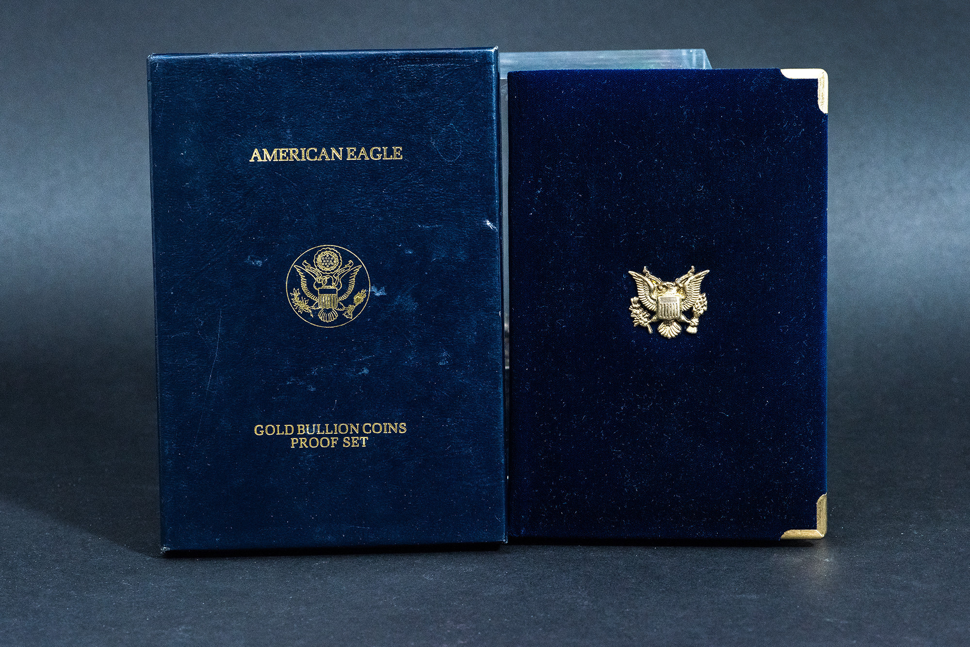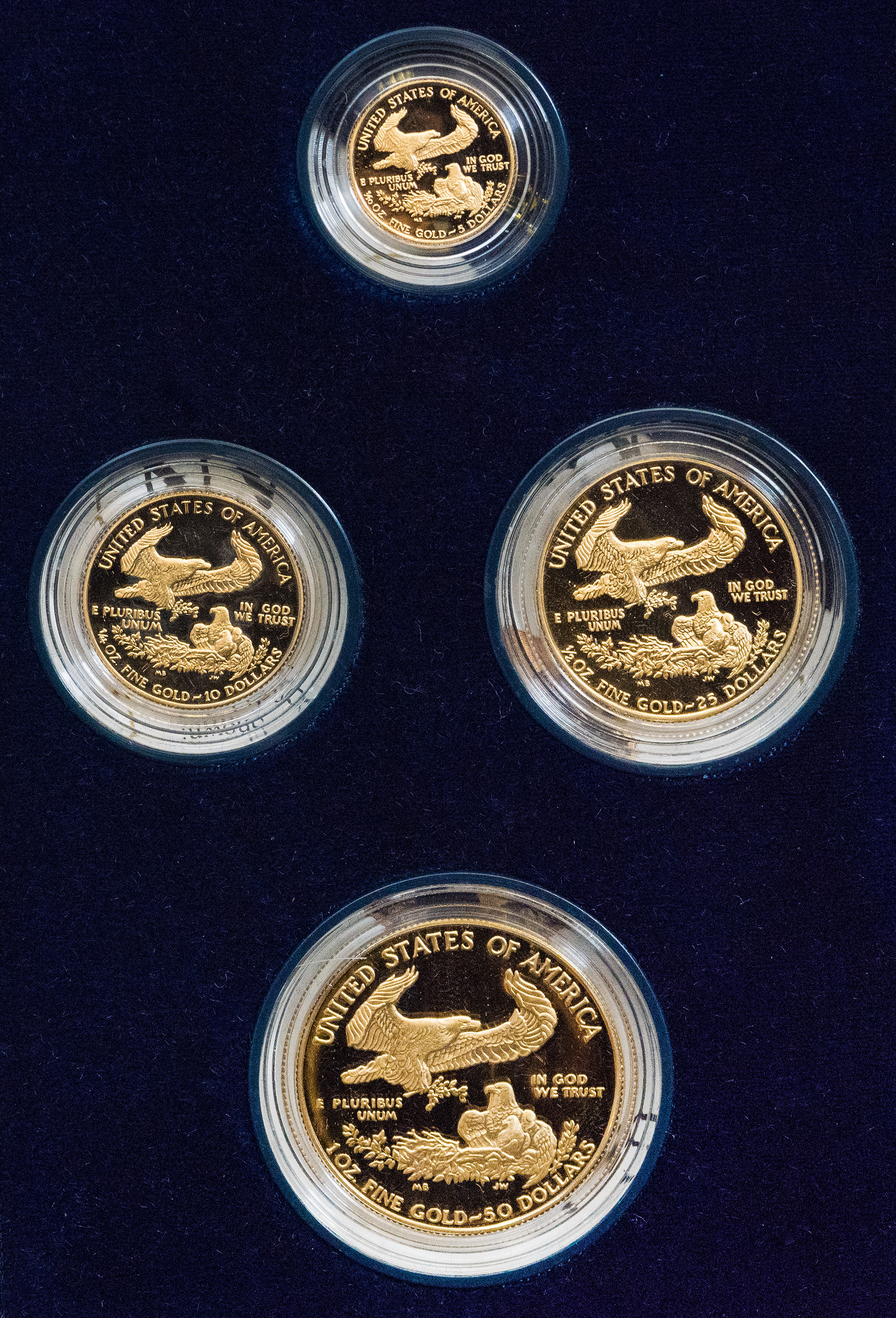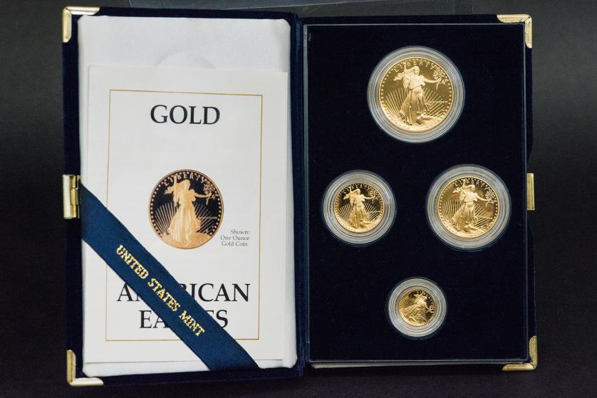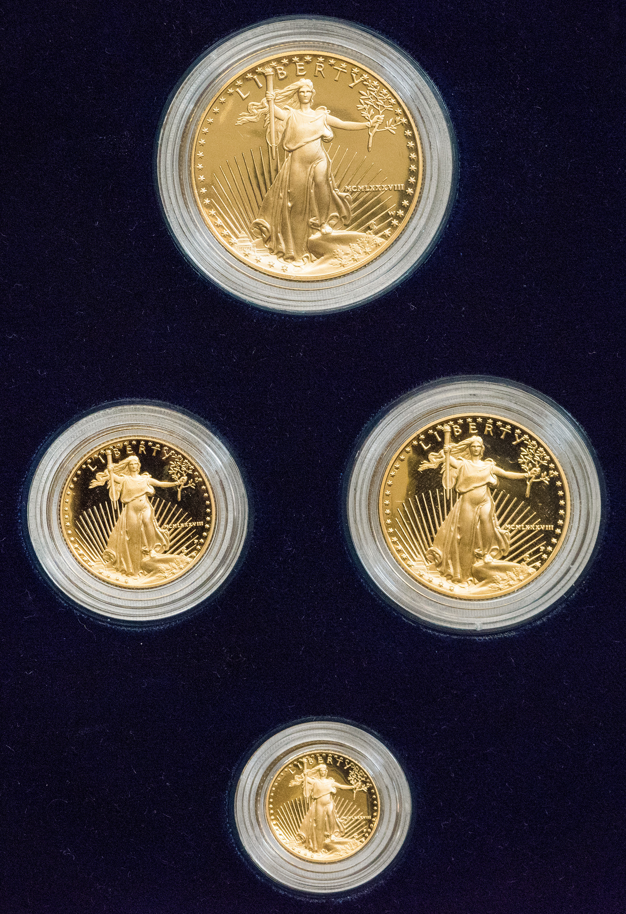 MONEDA EXTRANJERA. ESTADOS UNIDOS DE AMÉRICA. Estuche con 4 piezas American Eagle: 1, 1/2, 1/4 y 1/10 de onza. 1988. Proof Set. Con certificado original. Prueba.