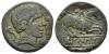 HISPANIA ANTIGUA. TAMUSIA. Unidad. A/ Cabeza masculina con collar a der. entre dos delfines. R/ Jinete lancero a der., debajo en cartela TaMUSIA. AE 6,43 g. 22,3 mm. I-895 var.; ACIP-1619 var.; CC-2370, mismo ejemplar. Pátina verde. MBC. Muy rara.