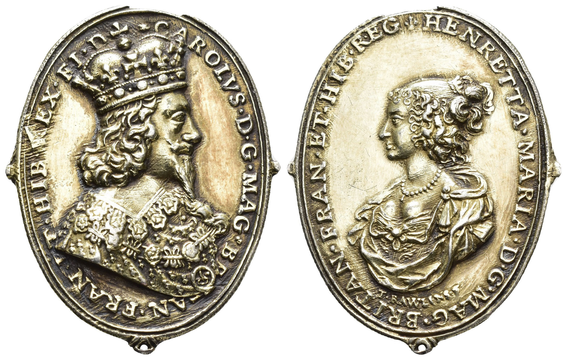 MONEDA EXTRANJERA. GRAN BRETAÑA. Carlos I y Enriqueta. Medalla 1642-1649. Sin la orla exterior. Grabador: T. Rawlins. AR 12,8 g 40 x 32 mm. Forrer V, p. 48. Fundida y con los campos burilados. MBC+. Rara.