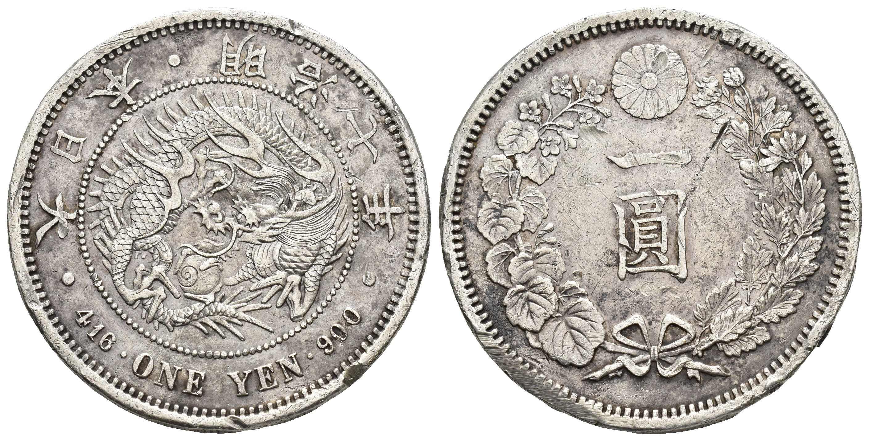MONEDA EXTRANJERA. JAPÓN. Yen. Año 7 (1874). AR 26,62 g. 38,4 mm. KM-A25.1 ó 2. Oxidaciones, rayitas y pequeñas marcas. Golpecitos en gráfila. MBC-.