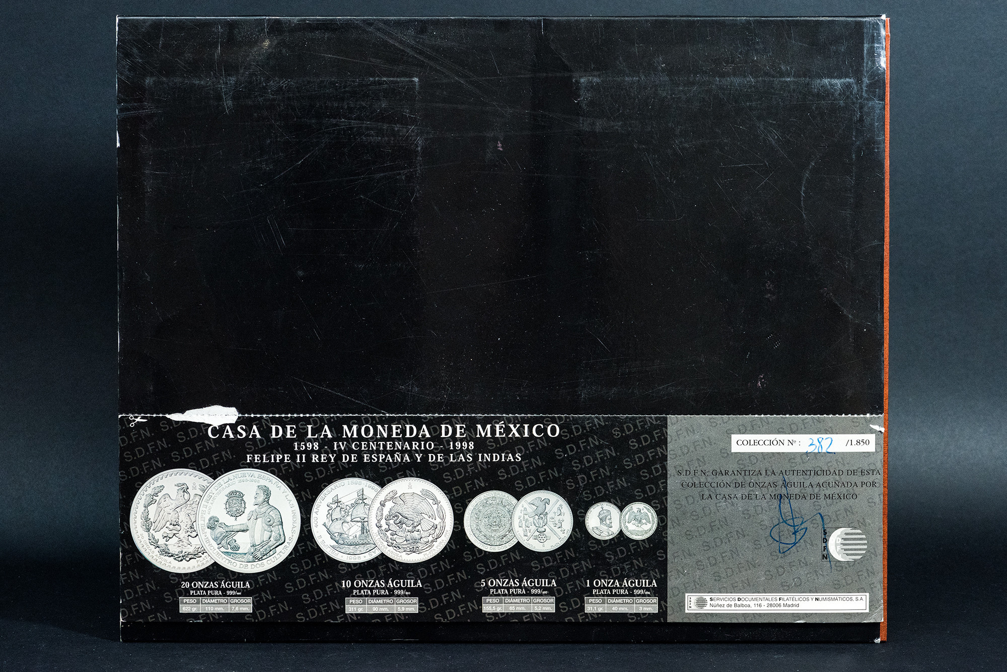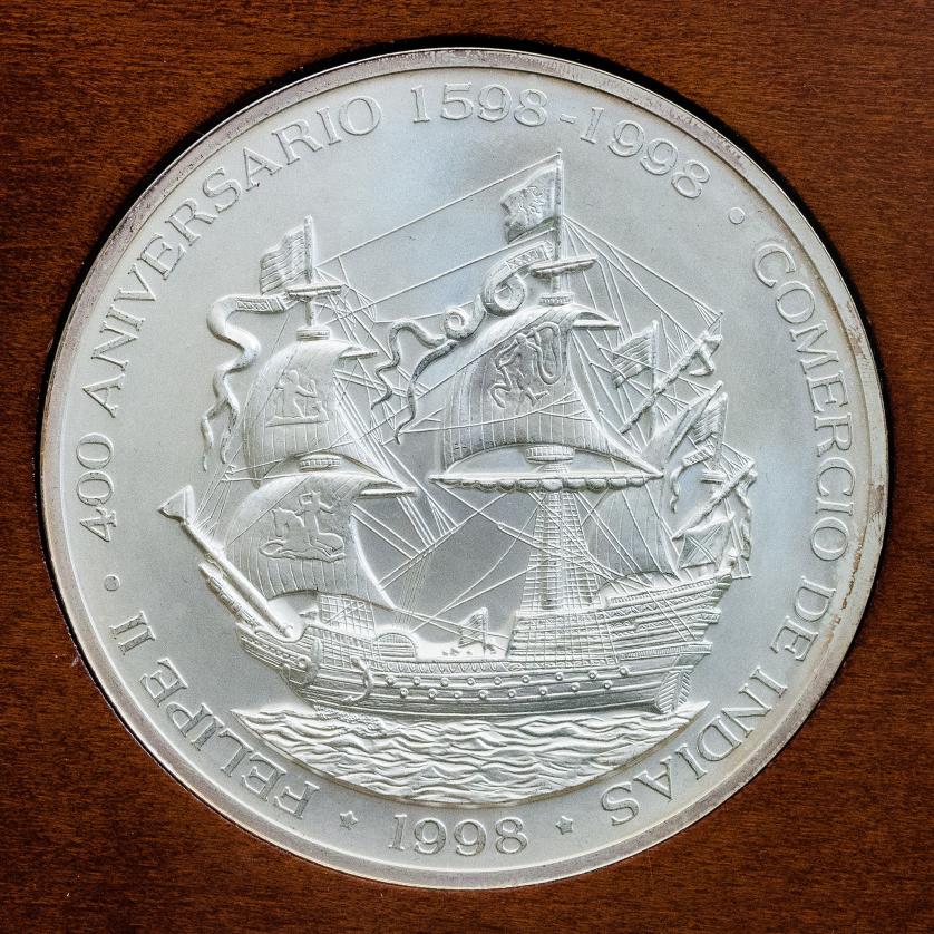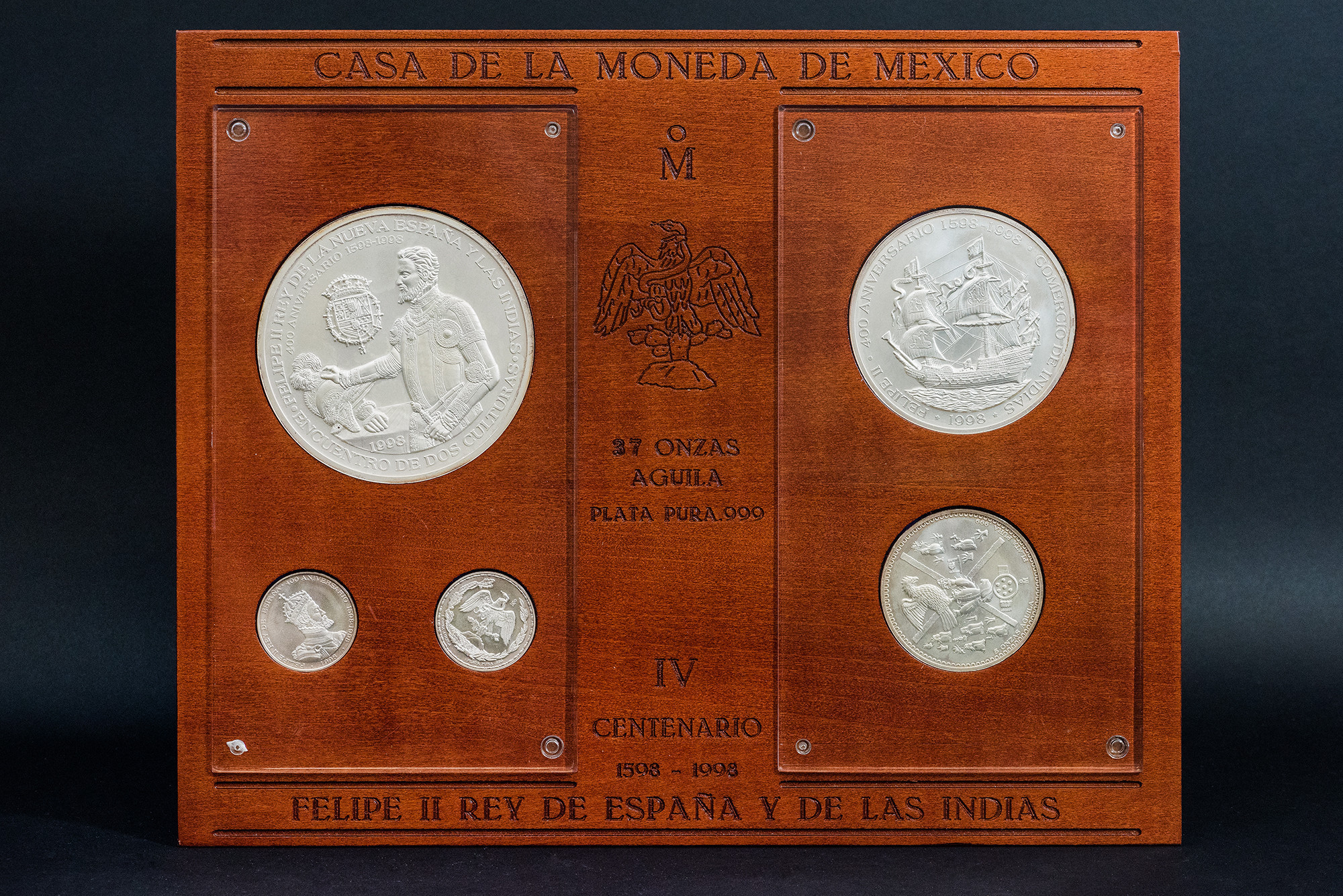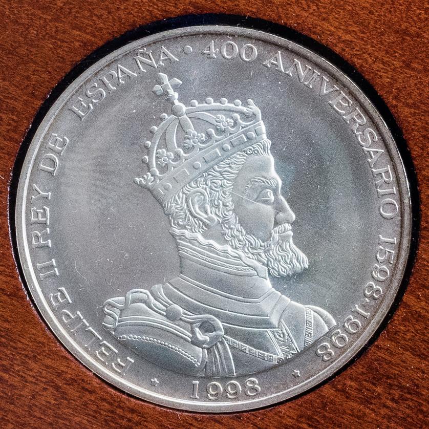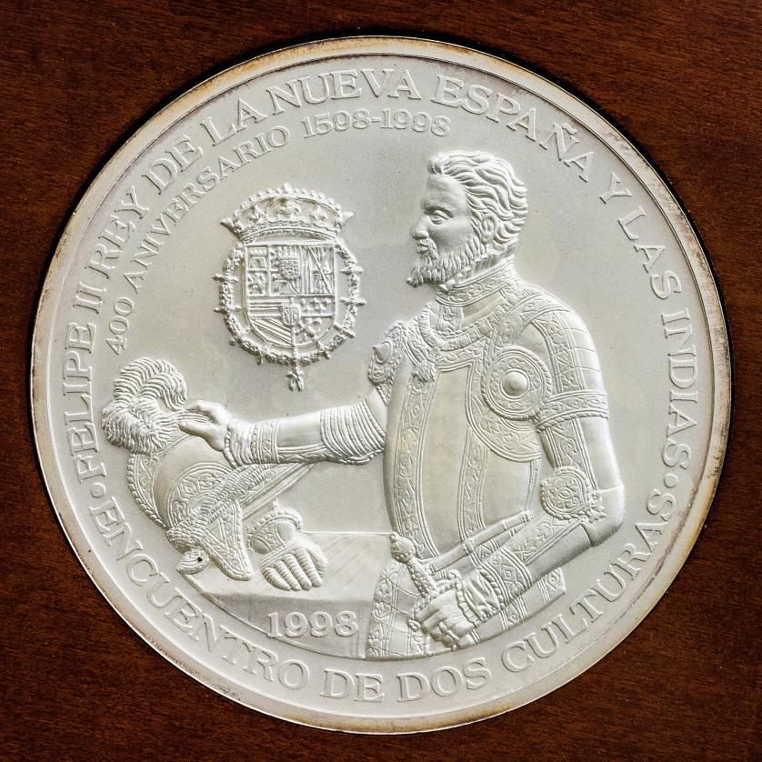 MONEDA EXTRANJERA. MÉXICO. Estuche IV Centenario Felipe II Rey de España y de las Indias con 4 medallas de 20, 10, 5 y 1 onza AR. Casa de la Moneda de México. En estuche y con certificado. SC.