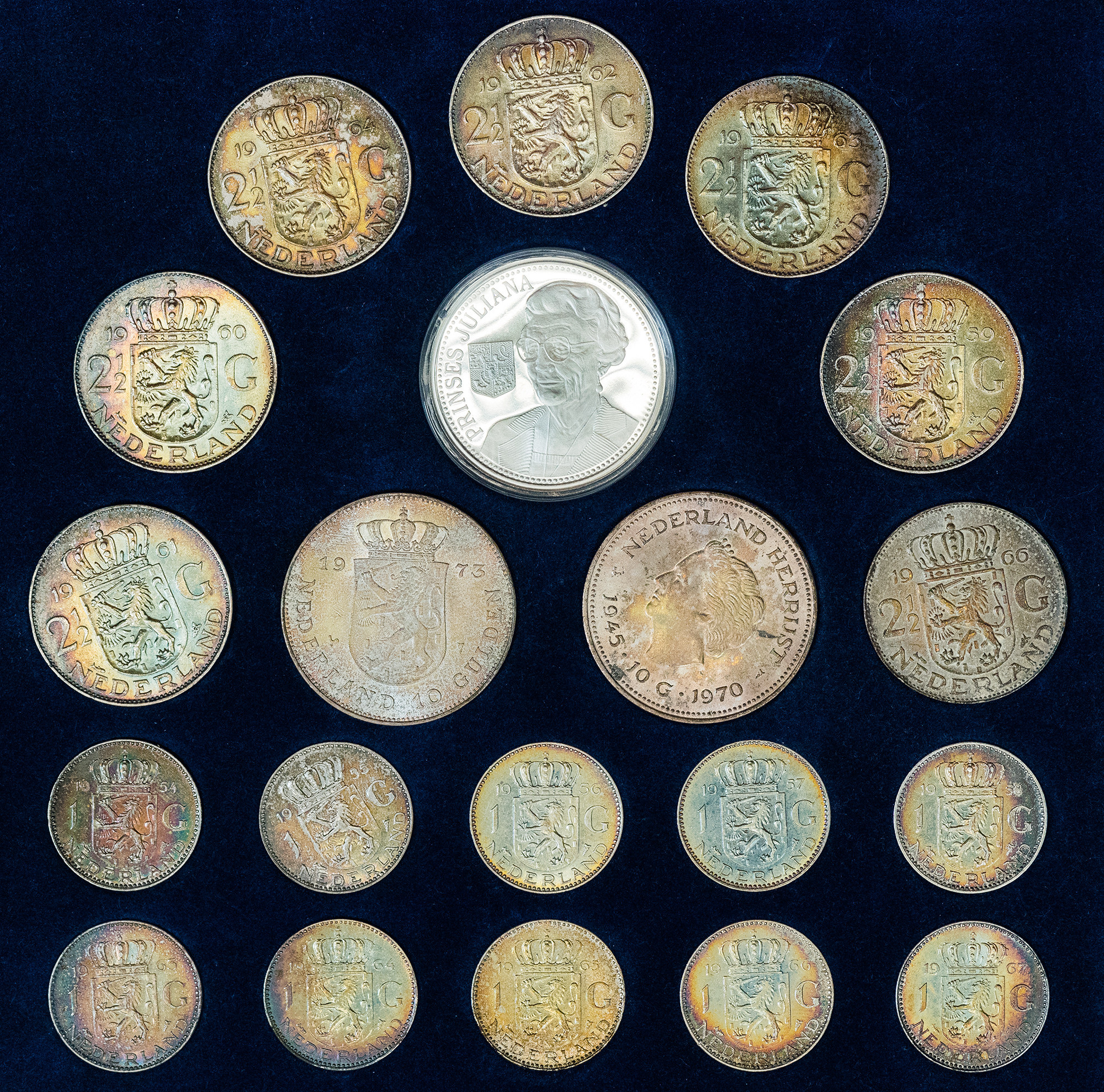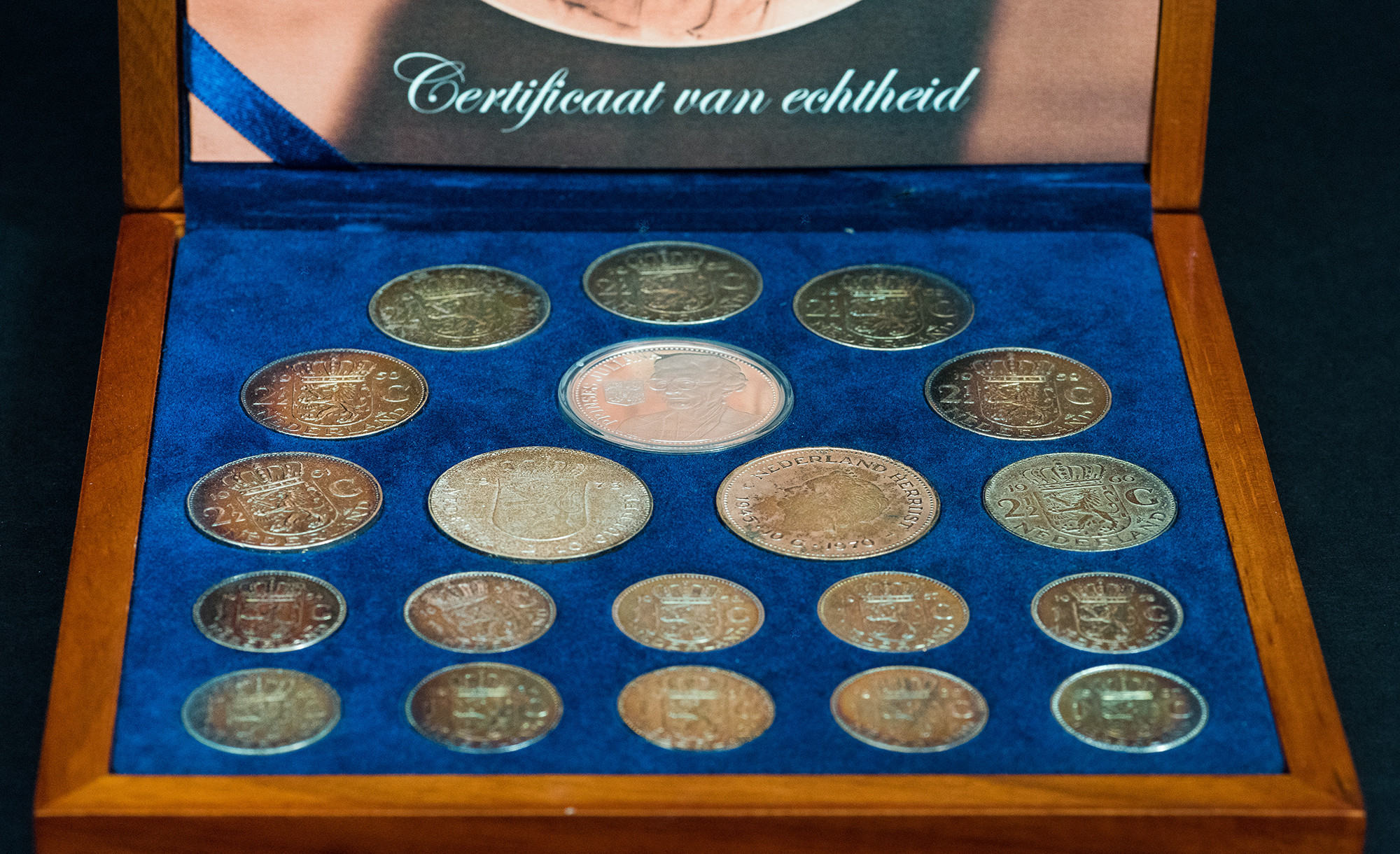 MONEDA EXTRANJERA. PAÍSES BAJOS. Juliana. Estuche de madera con 20 piezas de plata de diferentes fechas. Con certificado. EBC/SC.