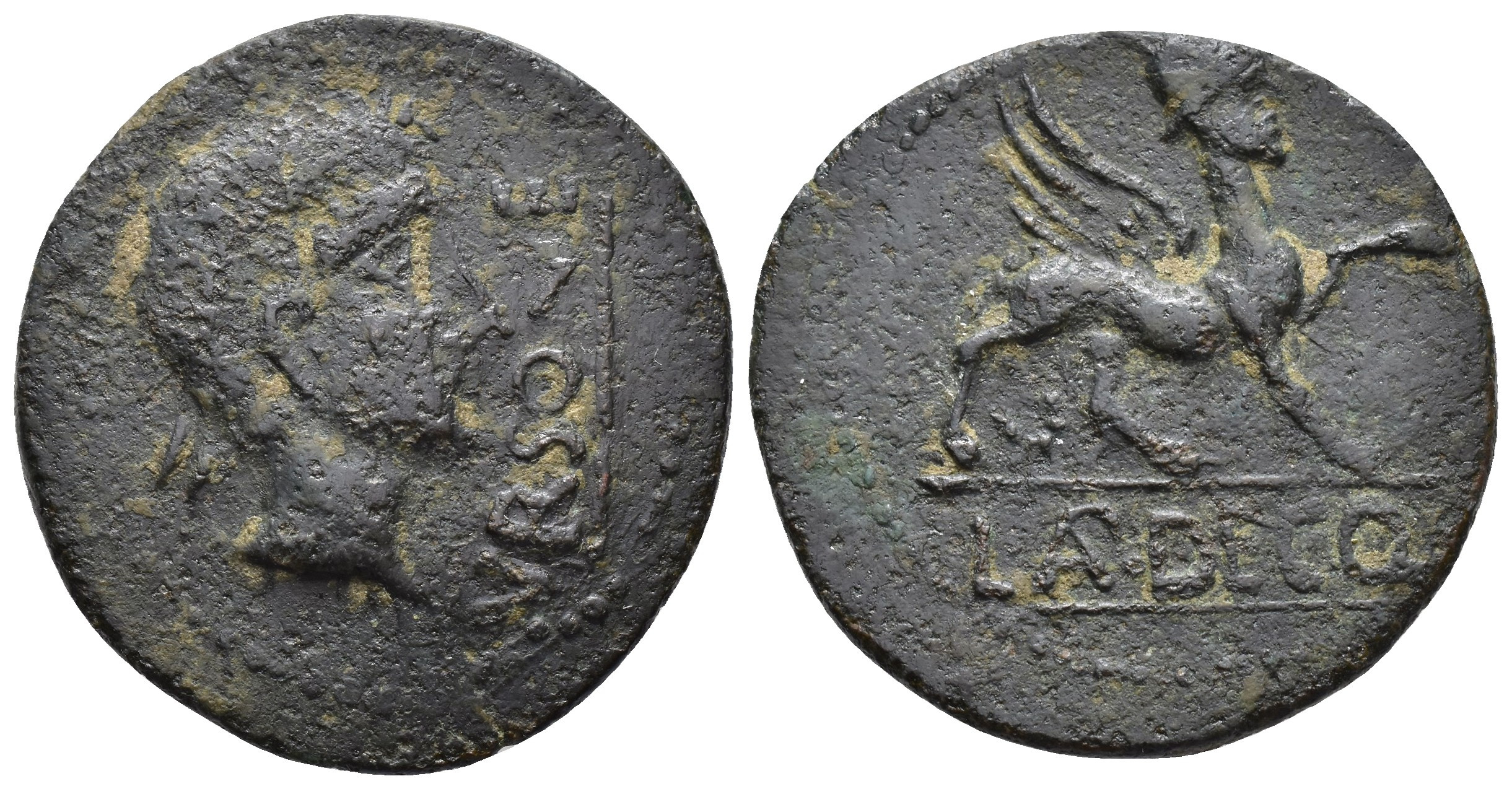 HISPANIA ANTIGUA. URSO. As. A/ Cabeza masculina diademada con ínfulas a der.; delante VRSONE con línea. R/ Esfinge avanzando a der., debajo entre líneas L. AP. DEC Q. AE 14,85 g. 33,5 mm. I-2499; ACIP-2325; CC-3636, mismo ejemplar. Pequeñas erosiones. Pátina oscura. MBC-. Escasa.