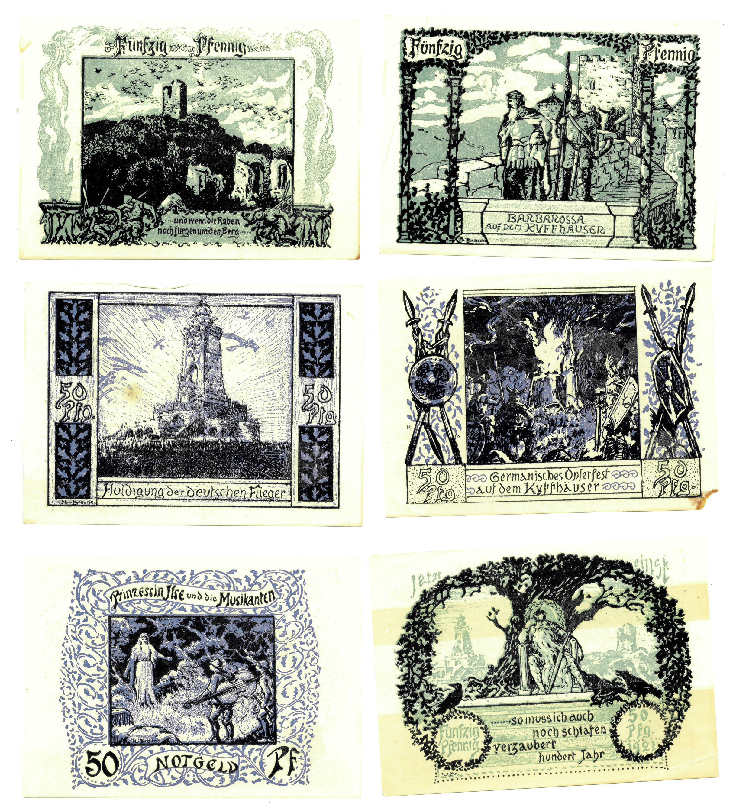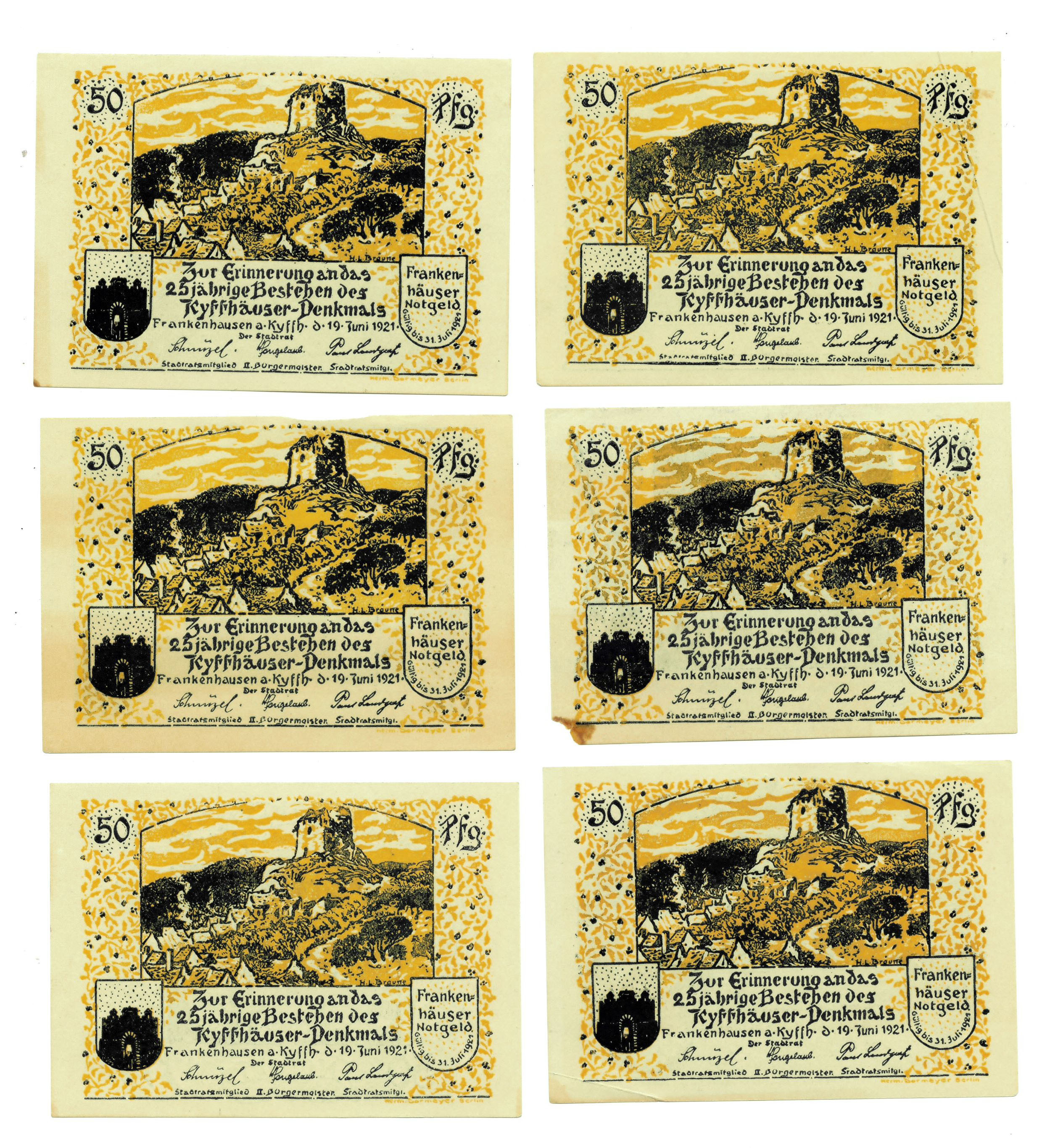 BILLETES EXTRANJEROS. ALEMANIA. Franken-Häuser. Lote de 6 billetes diferentes de 50 Pfennig 1921. EBC/SC.
