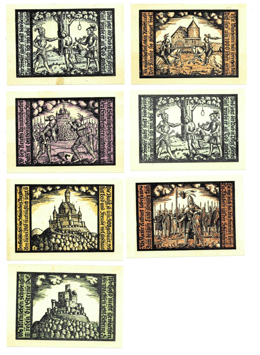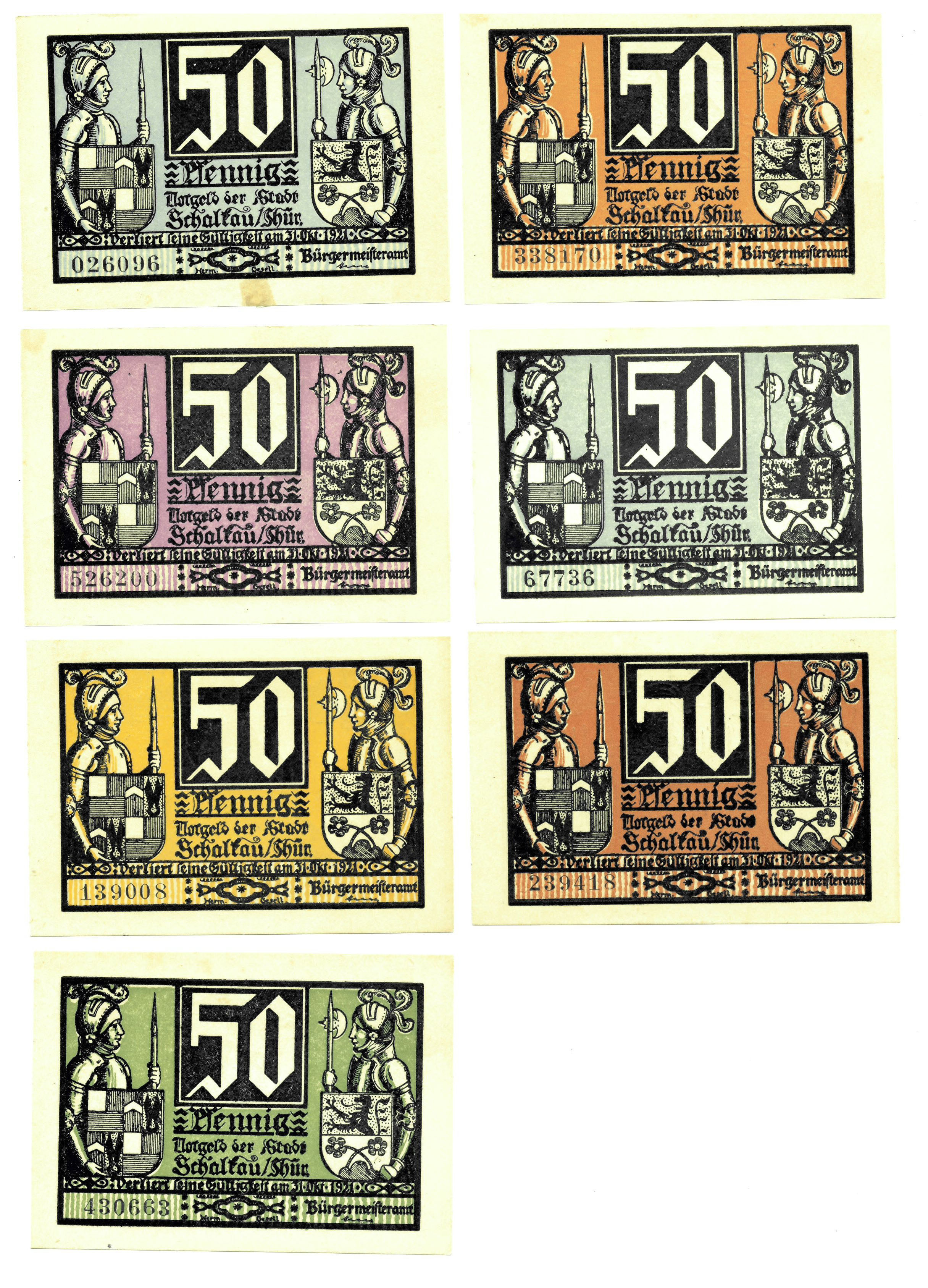 BILLETES EXTRANJEROS. ALEMANIA. Schalkan. Lote de 7 billetes de 50 Pfennig, 1921. Uno con manchas. SC.