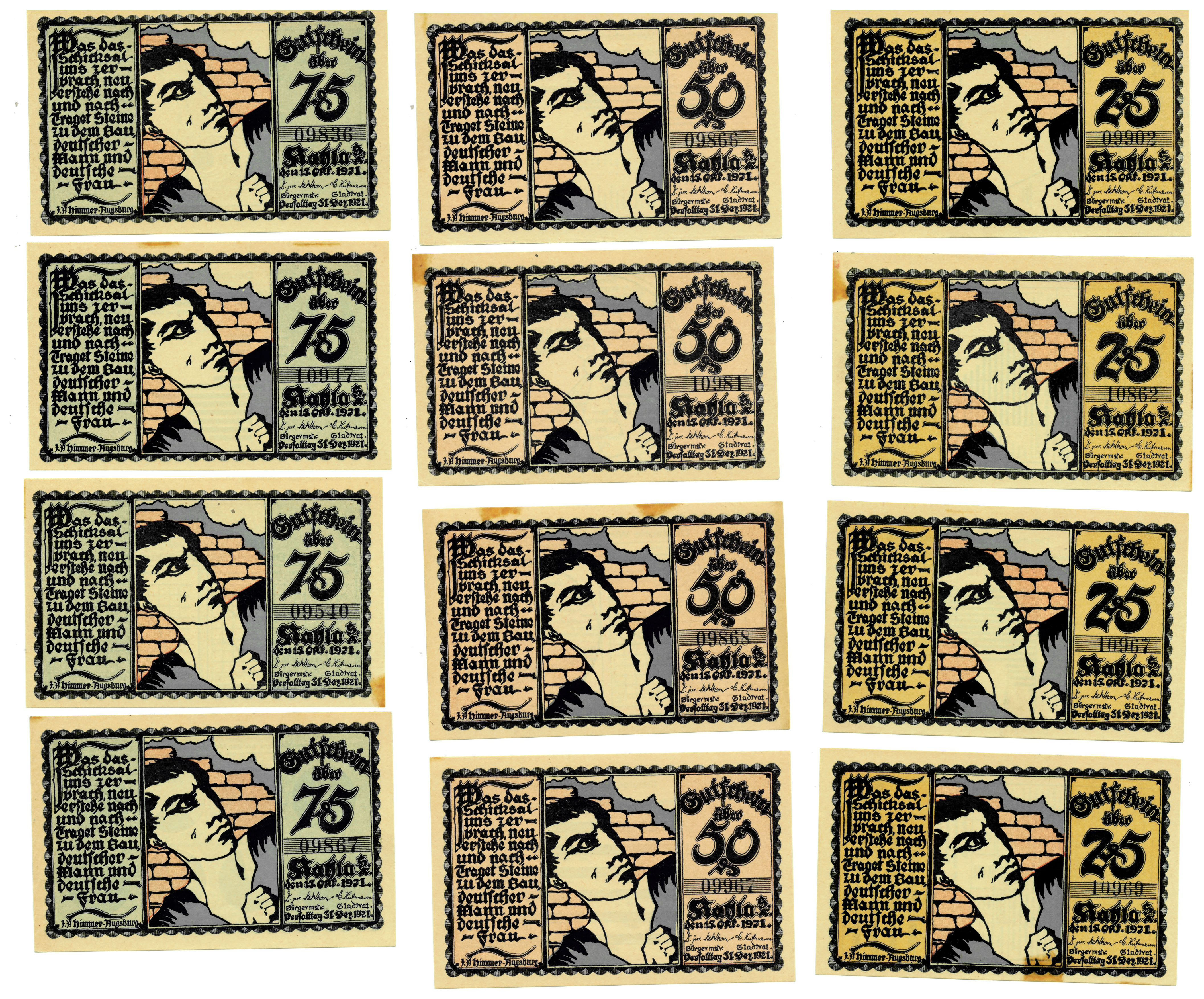 BILLETES EXTRANJEROS. ALEMANIA. Kahla. Lote de 12 billetes 1921: 25 Pfennig (4), 50 Pfennig (3) y 75 Pfennig (6). 5 con manchas. SC.