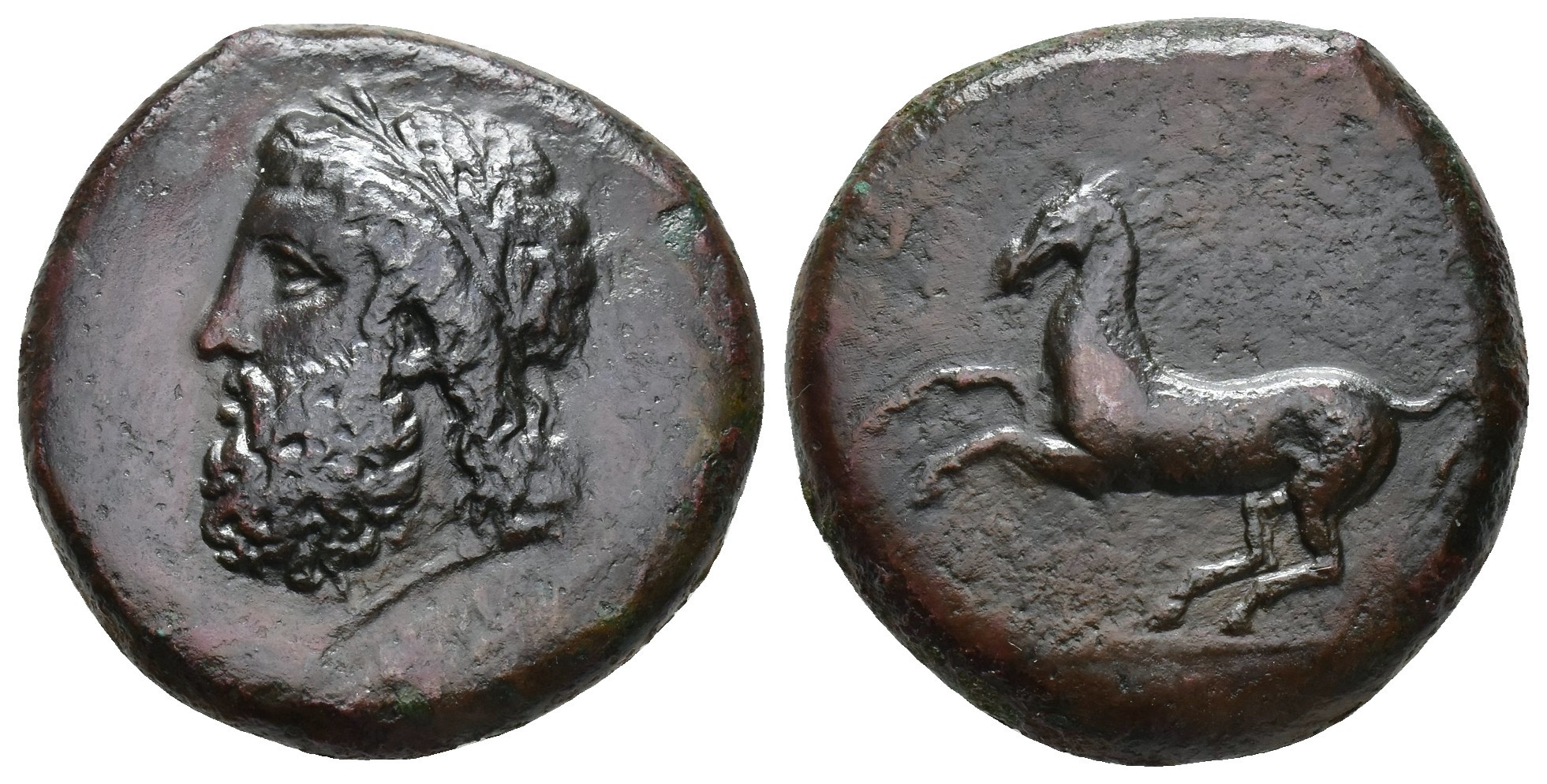 GRECIA ANTIGUA. SICILIA. Siracusa. Dilitron (344-336 a.C.). A/ Cabeza de Zeus Eleuterio a izq. No se ve leyenda. R/ Caballo encabritado a izq. AE 18,61 g. 26,4 mm. COP-725. MBC+/MBC.