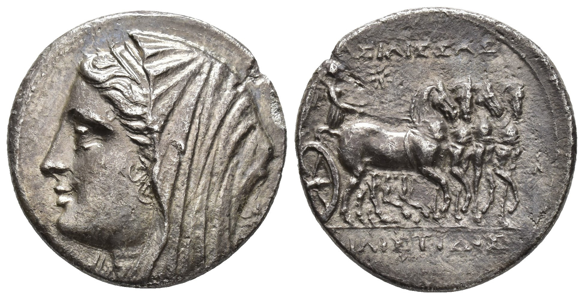 GRECIA ANTIGUA. SICILIA. Siracusa. 16 litras. Hierón II (216-215 a.C.). A/ Cabeza de Filistis velada a der., detrás estrella. R/ Cuadriga conducida por Niké a der., encima estrella, delante letra; (B)ASILISSAS/(F)ILISTIDOS. AE 11,98 g. 25,5 mm. COP-325. Pequeña rotura al borde. EBC-.