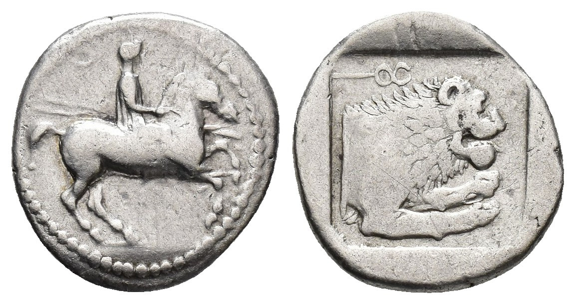 GRECIA ANTIGUA. MACEDONIA. Reyes de Macedonia. Perdikas II (454-413 a.C.) Tetróbolo. A/ Jinete con lanzas a der. R/ Prótomo de león a der., encima caduceo, todo dentro de cuadrado incuso. AR 2,34 g. 15,8 mm. COP-500 var. Pequeñas marcas. MBC-.