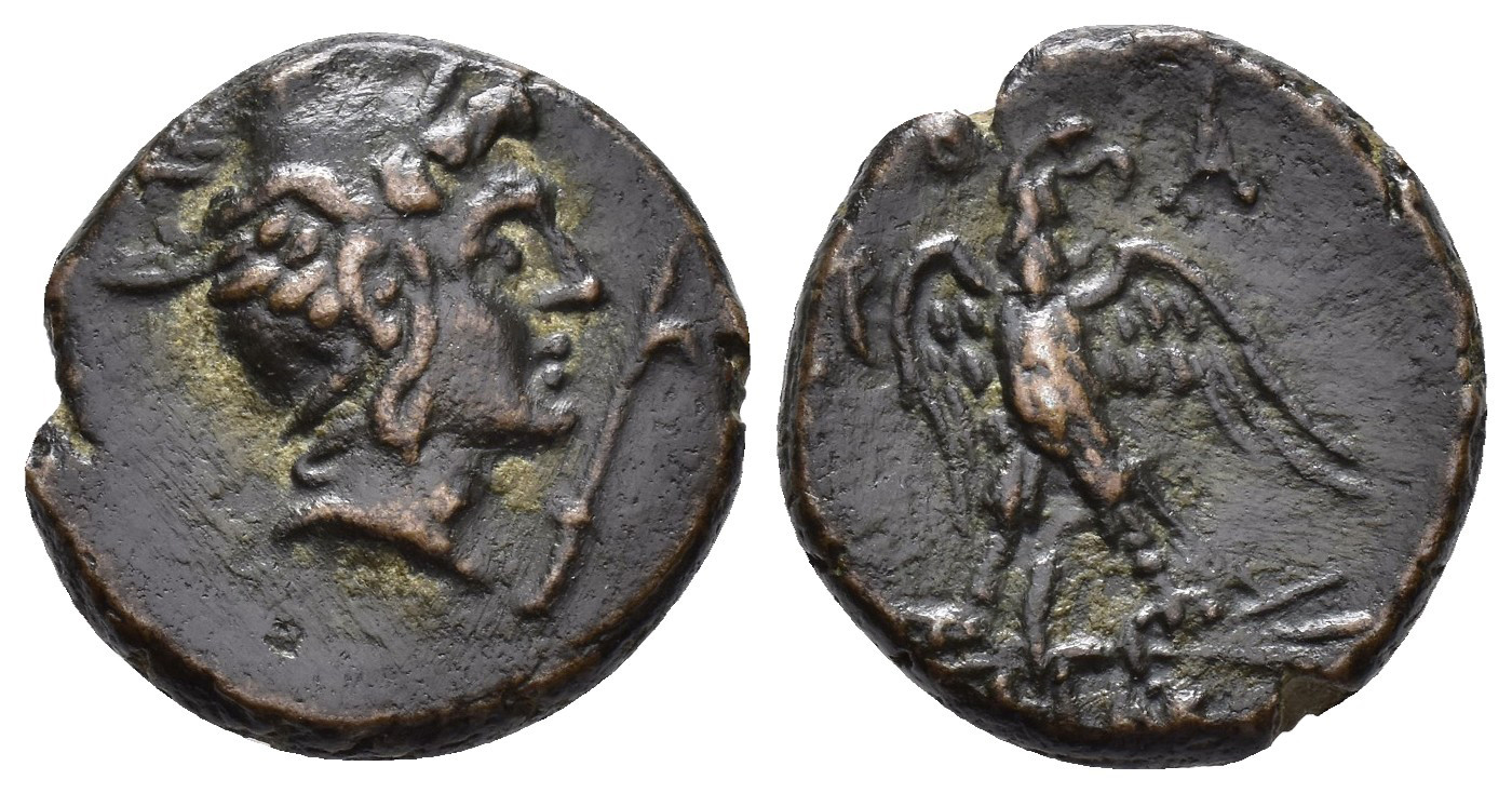 GRECIA ANTIGUA. MACEDONIA. Perseo (178-168 a.C.). AE. A/ Cabeza del héroe Perseo con casco alado rematado en esfinge a der., detrás harpe. R/ Águila a izq. con cabeza vuelta sobre haz de rayos, ; (B)-A. AE 5,71 g. 18,7 mm. COP-1275 ss. var. MBC+/MBC.