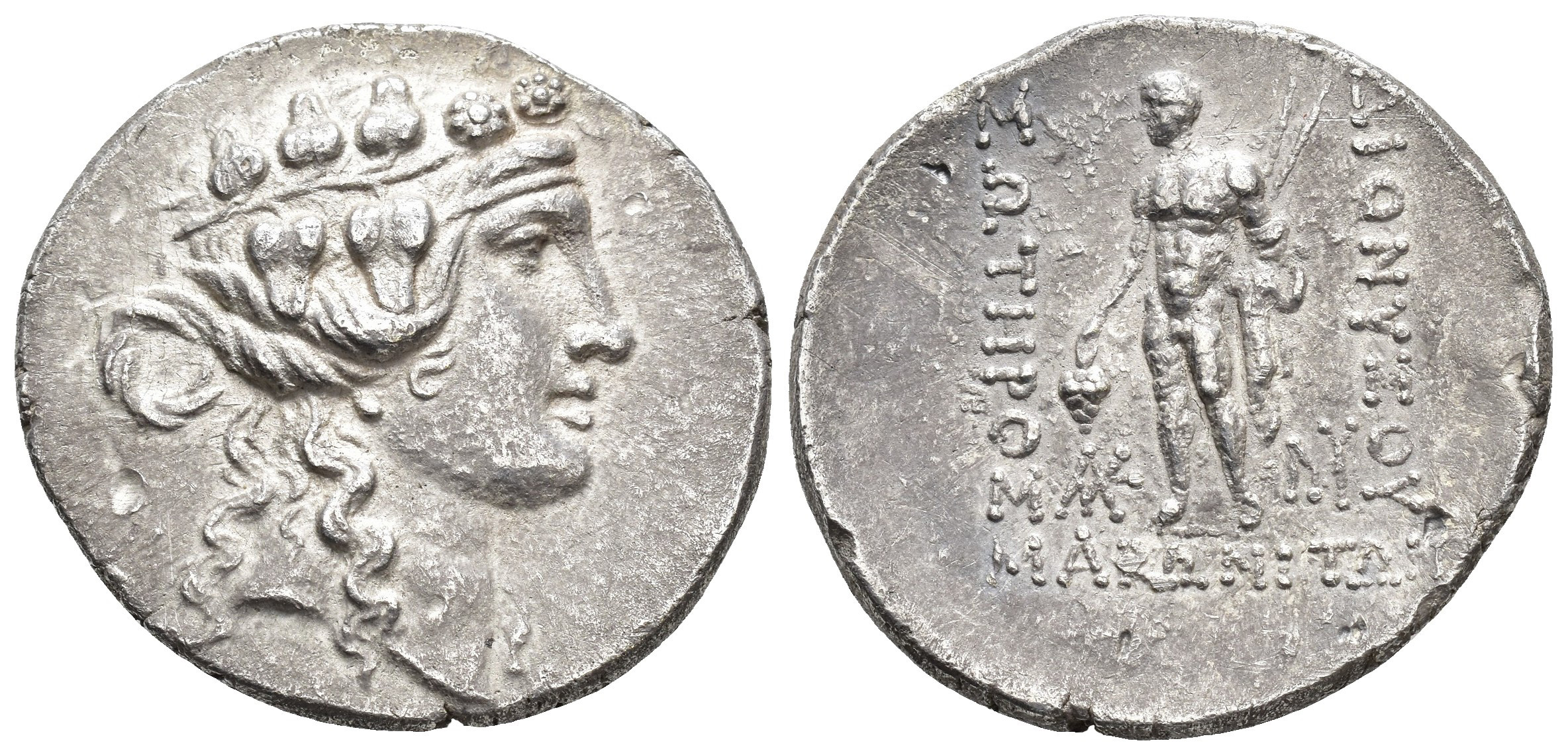 GRECIA ANTIGUA. TRACIA. Maroneia. Tetradracma (Post. 146 a.C.). A/ Cabeza de Dionisio a der. R/ Dionisio a izq. con dos lanzas, manto y racimo de uvas, a izq. Y der. monogramas. AR 16,2 g. 29,8 mm. COP-638 var. Monogramas. MBC.