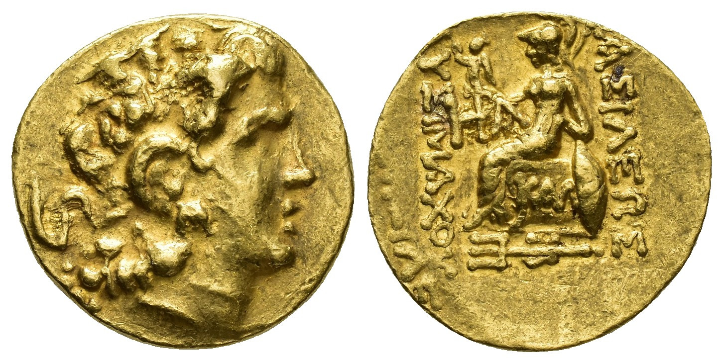 GRECIA ANTIGUA. TRACIA. Callatis. Estátera. Lisímaco (c. 89-72 a.C.). A/ Cabeza masculina con cuernos de Amón a der. (¿Mitrídates VI?) R/ Atenea entronizada a izq., debajo del trono KAL y tridente con dos delfines. AU 8,27 g. 18,9 mm. COP-1089. Restos de ley. de una acuñación anterior. EBC-/MBC+.