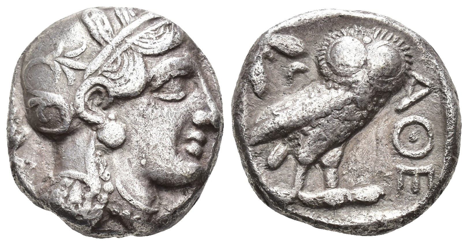GRECIA ANTIGUA. ÁTICA. Atenas. Tetradracma (454-404 a.C.). A/ Cabeza de Atenea a der. R/ Lechuza a der. mirando de frente; detrás creciente y rama de olivo, delante ley. griega AQE, todo dentro de cuadrado incuso. AR 16,27 g. 22,3 mm. COP-31 ss.; SBG-2526. MBC/MBC-.