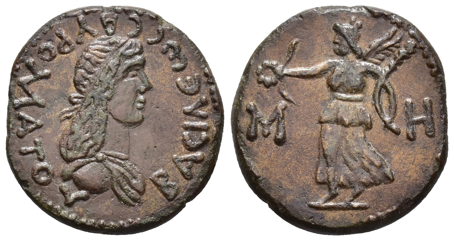 GRECIA ANTIGUA. REYES DEL BÓSFORO. AE. Sauromates I (93-96 d.C.). A/ Busto diademado y drapeado a der., alrededor ley. griega. R/ Nike avanzando a izq. Con corna y palma; M-H. AE 7,85 g. 24,9 mm. RPC-III.820. EBC-/MBC+.