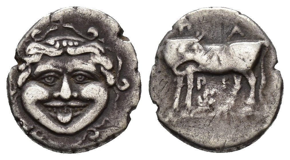 GRECIA ANTIGUA. MISIA. Pario. Hemilitra/hemidracma (s. IV a.C.). A/ Toro a izq. con cabeza vuelta, encima P-A, debajo ¿rama? R/ Gorgoneion. AR 2,13 g. 14,3 mm. COP-266. MBC/MBC-.