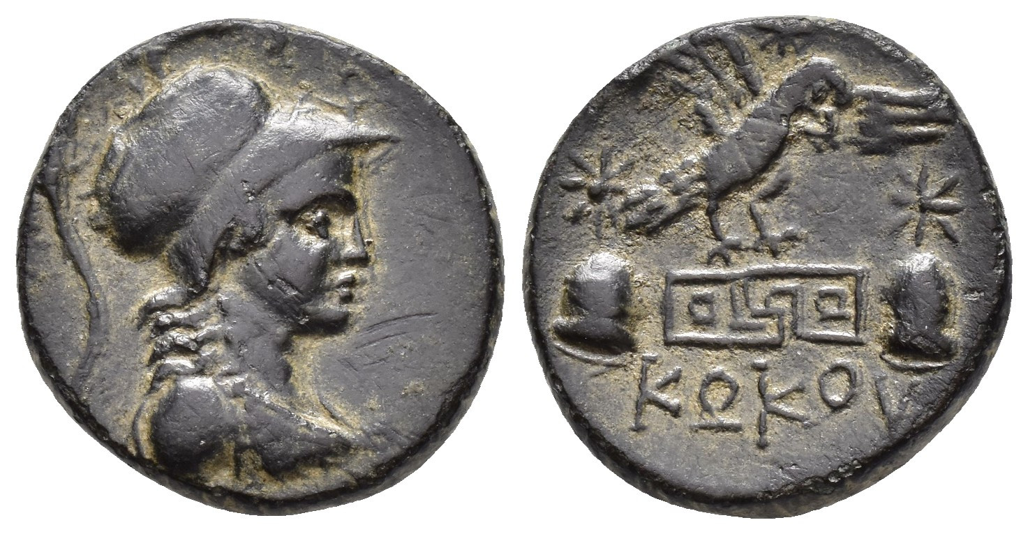 GRECIA ANTIGUA. FRIGIA. AE. (C. 133-48 a.C.). A/ Busto de Atenea a der. R/ Águila volando a der. sobre símbolo de Meandro, a cada lado píleo con estrella, debajo magistrado KOKOY. AE 7,12 g. 20 mm. COP-161. Rayita. Pátina verde. MBC+.