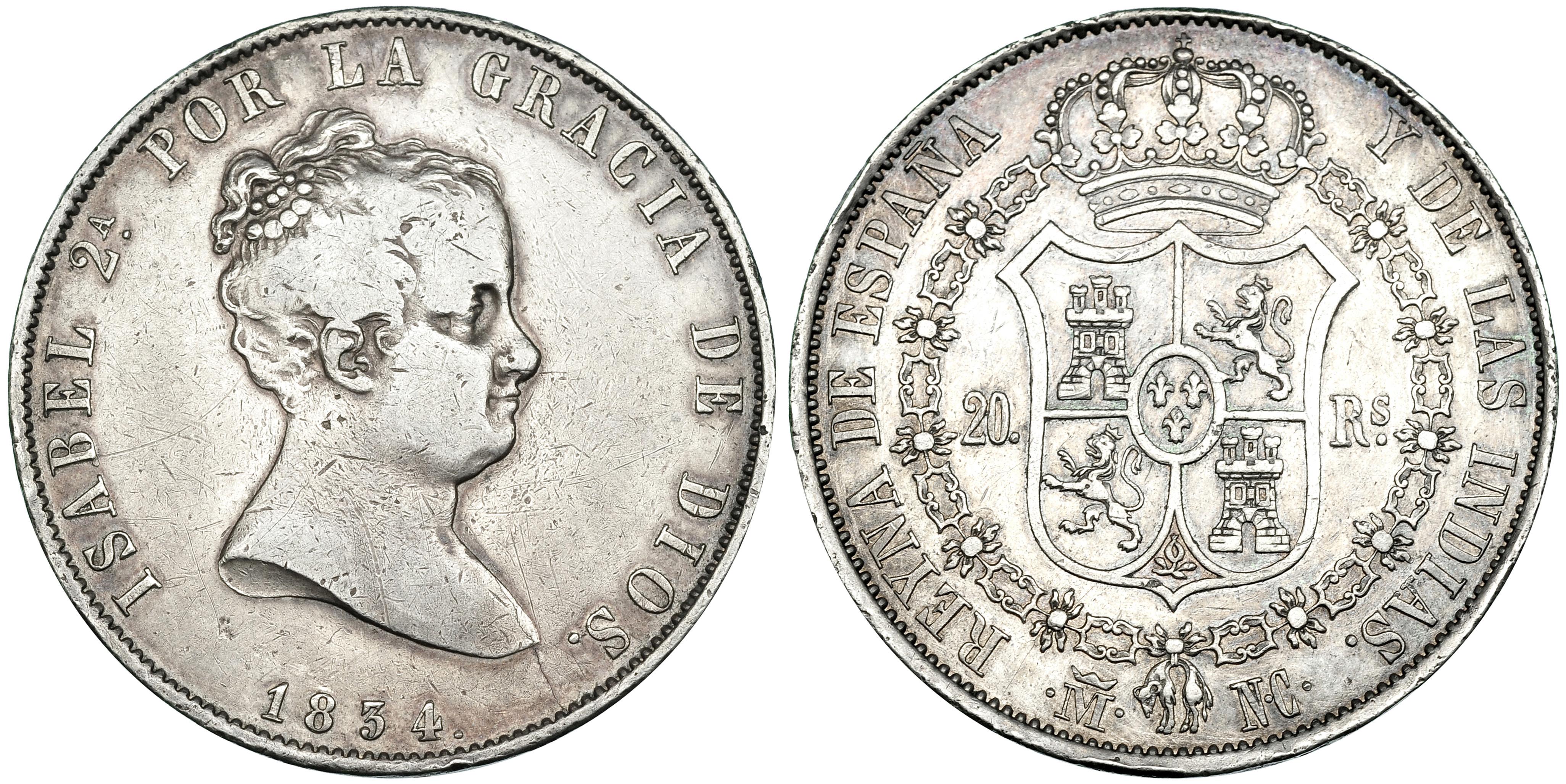 20 reales. 1834. Madrid. NC. VI-494. Pequeñas marcas. MBC. Rara.