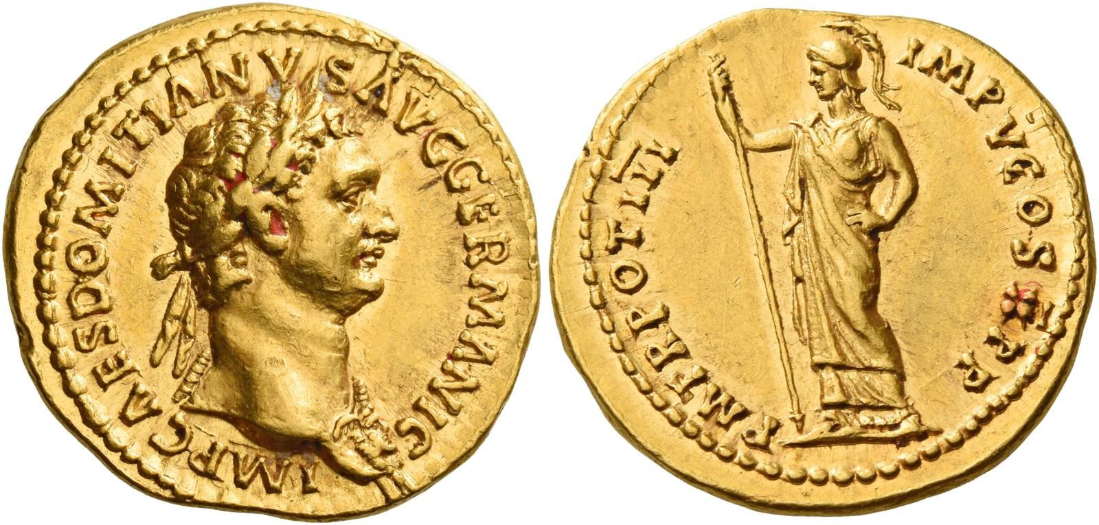 DOMITIAN AUGUSTUS. Aureus. AV 7.77 g. IMP CAES DOMITIANVS AVG GERMANIC Laureate bust r., wearing aegis. Rev. P M TR POT III IMP V COS X P P Minerva standing l., holding sceptre in r. hand. Very rare. A spectacular portrait of excellent style struck in high relief and a very elegantly engraved reverse die. Extremely fine.