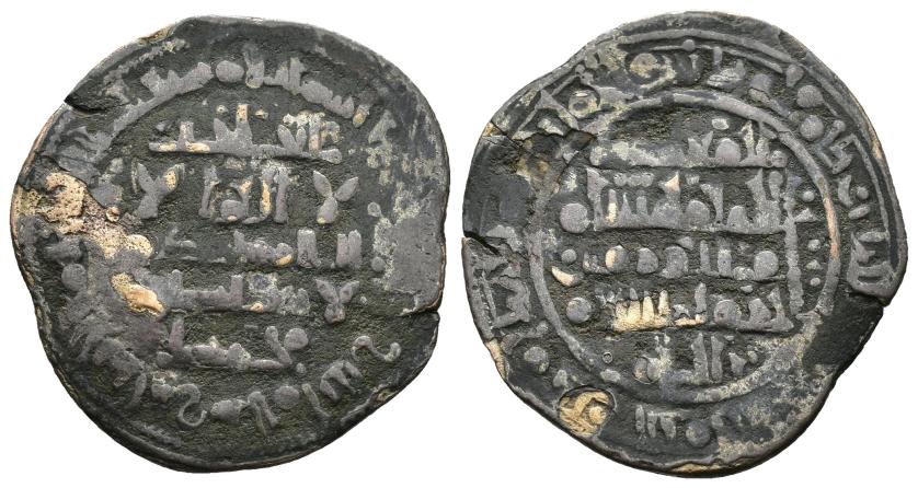 558   -  REINOS DE TAIFAS. TAIFA DE SEVILLA. AL-MU'TADID BI-LLAH ABU 'AMR 'ABBAD B. MUHAMMAD B. 'ABBAD (433-461/1041-1068). Dírham. (Sevilla / اشبيلية). xx5 H. VE 2,79 g. 25 mm. Tipo V-908; PV-398. Dos perforaciones. BC.
