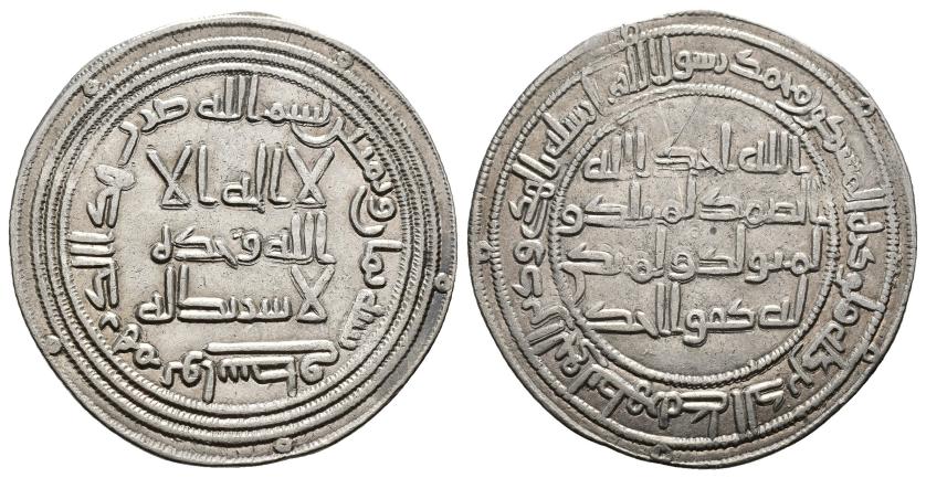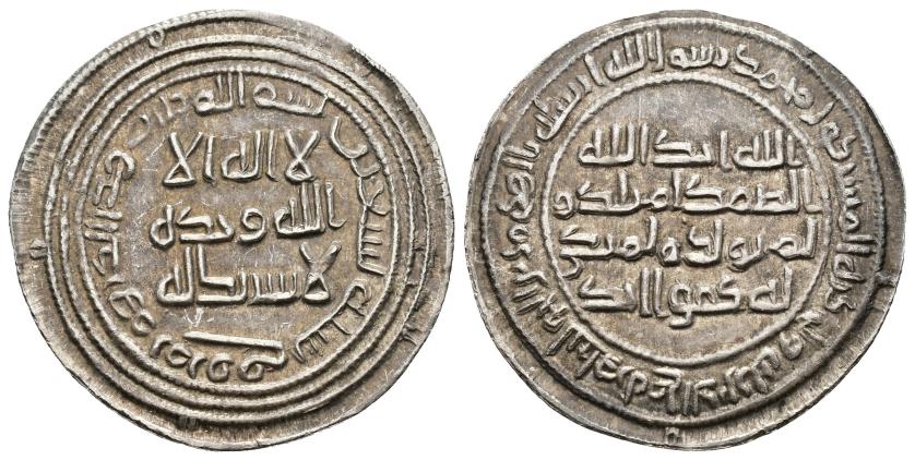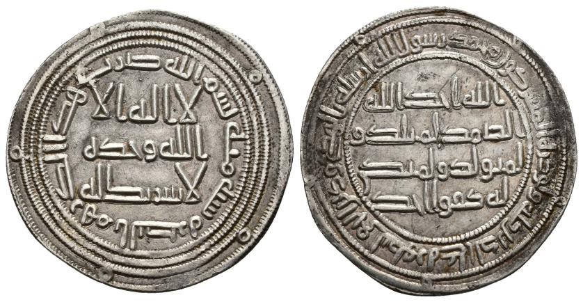 CALIFATO OMEYA. UMAR II IBN 'ABD AL-'AZIZ (99-102/717-720). Dírham. Damasco. 100 H. AR 2,84 g. 27 mm. Walker II-377; Klat-344. Leves oxidaciones. EBC-. Muy escasa.