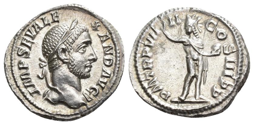 IMPERIO ROMANO. ALEJANDRO SEVERO. Denario. Roma (230). A/ Cabeza laureada y drapeada al hombro a der.; IMP SEV ALEXAND AVG. R/ Sol mirando a izq. cogclobo y mano derecha levantada; P M TR P VIII COS III P P. AR 2,94 g. 19,91 mm. RIC-101b. SC.