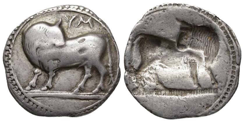 GRECIA ANTIGUA. LUCANIA. SIBARIS. Estátera (550-510 a.C.). A/ Toro a izq. con cabeza vuelta; encima MYM(SY). R/ Incuso. AR 7,41 g. 27,1 mm. COP-1390; SBG-245 var. MBC-.