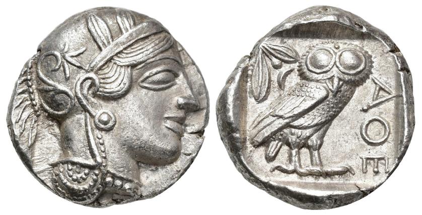 GRECIA ANTIGUA. ÁTICA. Atenas. Tetradracma (454-404 a.C.). A/ Cabeza de Atenea a der. con casco adornado. R/ Lechuza a der. mirando de frente; detrás creciente y rama de olivo, delante ley. griega AQE, todo dentro de cuadrado incuso. AR 17,17 g. 24,9 mm. COP-31-40. SBG-2526. Cospel ligeramente abierto. EBC.