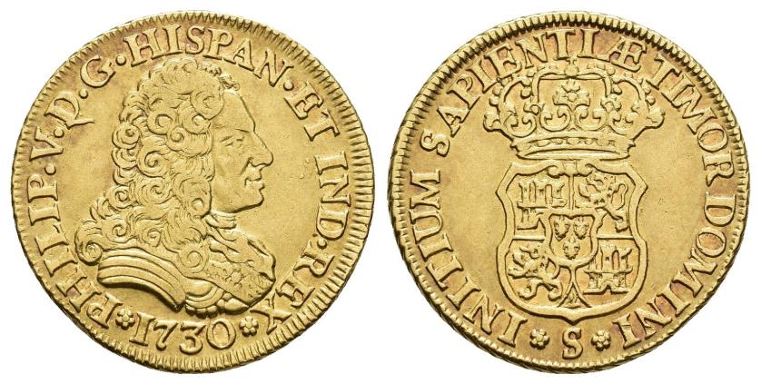 FELIPE V. 2 escudos. 1730. Sevilla. Sin valor ni ensayador. AU 6,66 g. 21,2 mm. VI-1519; AC-1984. R.B.O. MBC+. Muy escasa.