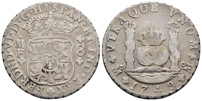 FERNANDO VI. 8 reales. 1749. México. MF. AR 26,7 g. 38,5 mm. VI-357; AC-473. MBC-.