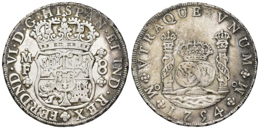 FERNANDO VI. 8 reales. 1754. México. MF. Coronas imperial y real. AR 26,83 g. 39,3 mm. VI-364; AC-485. MBC.
