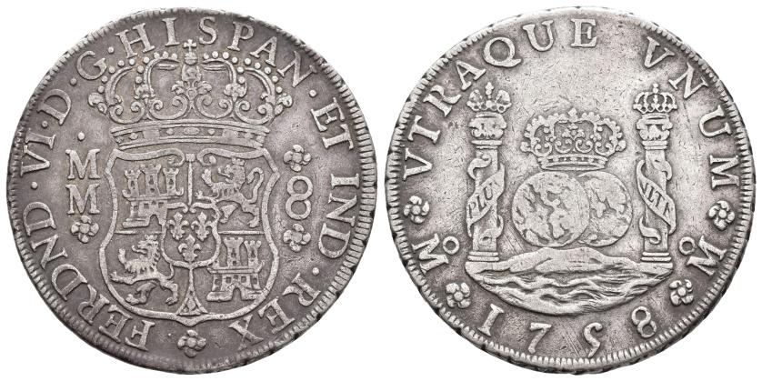 FERNANDO VI. 8 reales. 1758. México. MM. AR 26,84 g. 38,3 mm. VI-369; AC-494. MBC.
