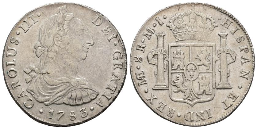 CARLOS III. 8 reales. 1783. Lima. MI. AR 26,94 g. 39,1 mm. VI-900; AC-1051. Pequeña concreción en anv. MBC+.