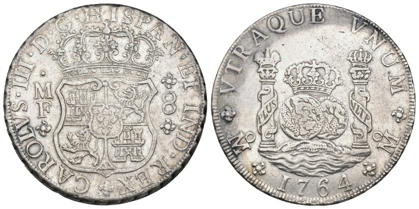 CARLOS III. 8 reales. 1764. México. MF. AR 26,79 g. 38,6 mm. VI-922; AC-1087. Oxidaciones limpiadas en rev. MBC+.