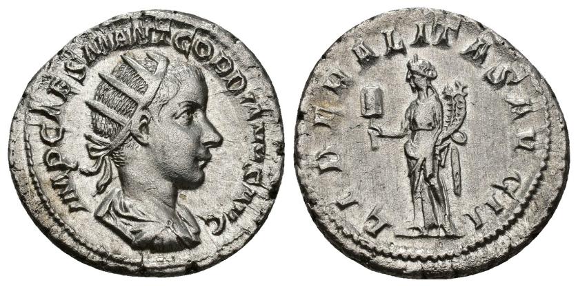 IMPERIO ROMANO. GORDIANO III. Antoniniano. Roma (240). A/ Busto radiado y drapeado a der.; IMP CAES M ANT GORDIANVS AVG. R/ Liberalitas con ábaco y cornucopia a izq.; LIBERALITAS AVG II. VE 4,69 g. 22,3 mm. RIC-36. MBC+.