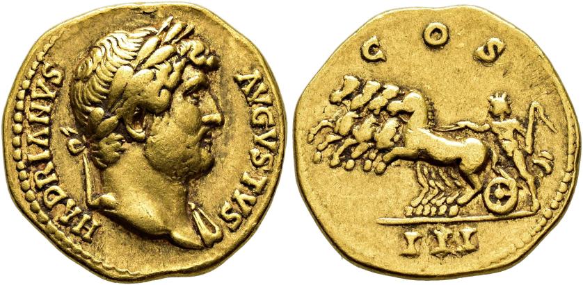 IMPERIO ROMANO. ADRIANO. Roma. Áureo (124-125). A/ Cabeza laureada y drapeada al hombro a der.; HADRIANVS AVGVSTVS. R/ Sol conduciendo cuadriga a izq.; COS III. AU 7,22 g. 19,4 mm. RIC-726; Cal.-1209. MBC.