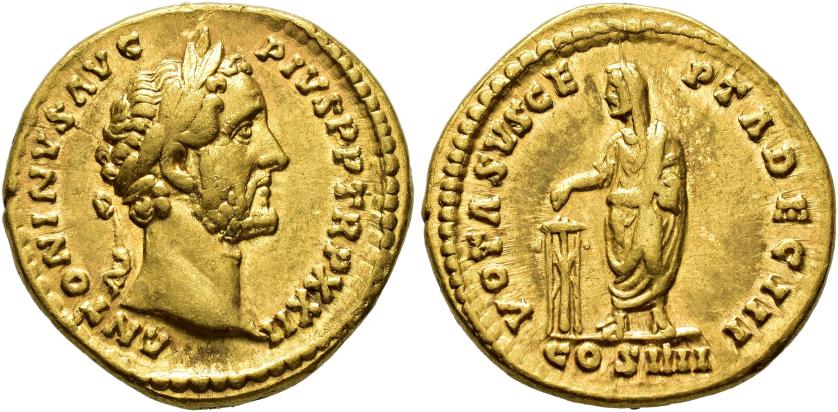 IMPERIO ROMANO. ANTONINO PÍO. Roma. Áureo (158-159). A/ Cabeza laureada a der.; ANTONINVS AVG PIVS P P TR P XXII. R/ El emperador togado y velado a izq. ofrendando en trípode ante él; VOTA SVSCEPTA DEC III, exergo COS IIII. AU 7,19 g. 19,2 mm. RIC-294Ad; Cal.-1714. Pequeñas marcas. R.B.O. MBC+/MBC.