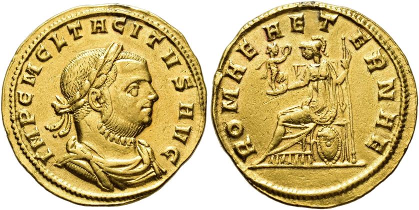 IMPERIO ROMANO. TÁCITO. Roma. Áureo (275-276). A/ Busto laureado, drapeado y acorazado a der.; IMP C M CL TACITVS AVG. R/ Roma sentada sobre escudo a izq. con lanza en izq. y en der. victoria que le tiende una corona; ROMAE AETRENAE. AU 4,54 g. 20,5 mm. RIC-75; Cal.-4093. Golpecito en gráfila del rev. MBC+/MBC. Rara.