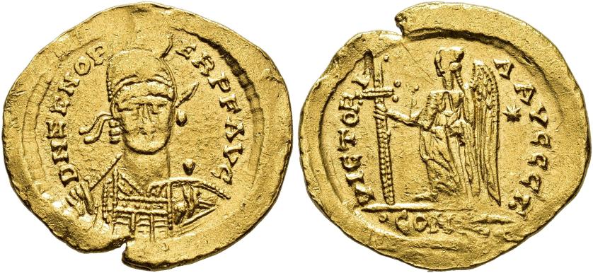 IMPERIO ROMANO. ZENÓN. Roma. Sólido (476-491). A/ Busto frontal con coraza, casco, lanza y escudo; D N ZENO PER P F AVG. R/ Victoria a izq. con cruz, detrás estrella; VICTORIA AVGGG gamma. , -/-//.COM(OB.). AU 4,34 g. 21,69 mm. RIC-3656. Acuñación defectuosa. Cospel abierto. Raya en rev. MBC/MBC+. R.B.O. Muy rara.
