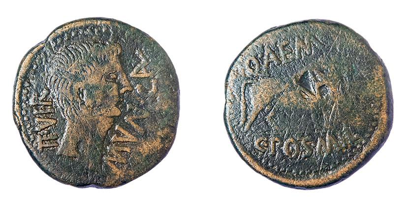 70   -  COLECCIÓN CORES. CASCANTUM. TIBERIO. As. A/ Cabeza laureada a der.; TI CAESAR DIVI AVG F AVGVSTVS. R/ Toro a der., MVNICIP/CASCANTVM. Contramarca cabeza de águila a izq. en anv. y otra en rev. AE 12,35 g. 28 mm. RPC-427. APRH-427. ACIP-3159. CC-4950, mismo ejemplar. BC+.