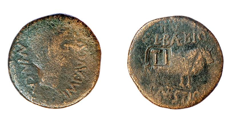 COLECCIÓN CORES. CALAGURRIS. ¿AUGUSTO? As. A/ Cabeza a der.; II VIR-MVN CAL. R/ Toro a der.; Q ANTONI/ L FABI. Imitación o emisión irregular. AE 11,82 g. 29 mm. RPC-438. APRH-438, esta moneda ilustrada. ACIP-3119, vte. estilo. CC-4994, mismo ejemplar. Pátina verde. MBC/MBC-.