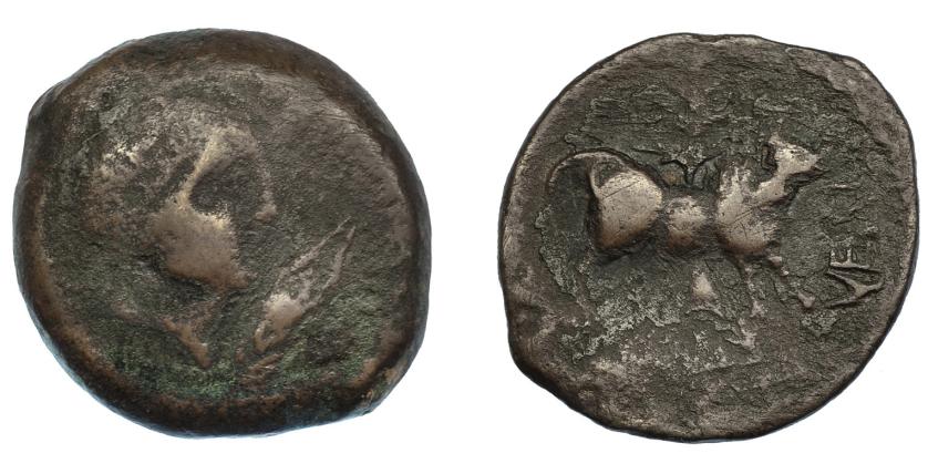 HISPANIA ANTIGUA. OBULCO. Duplo. A/ Cabeza femenina con moño a der. R/ Arado a der., debajo espiga a izq. y debajo OBVLCO en cartela. AE 23,39 g. 27,6 mm. I-1820. ACIP-2180 vte. BC+. Muy rara.